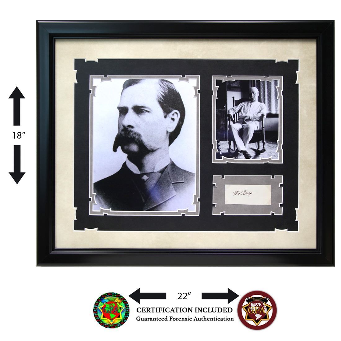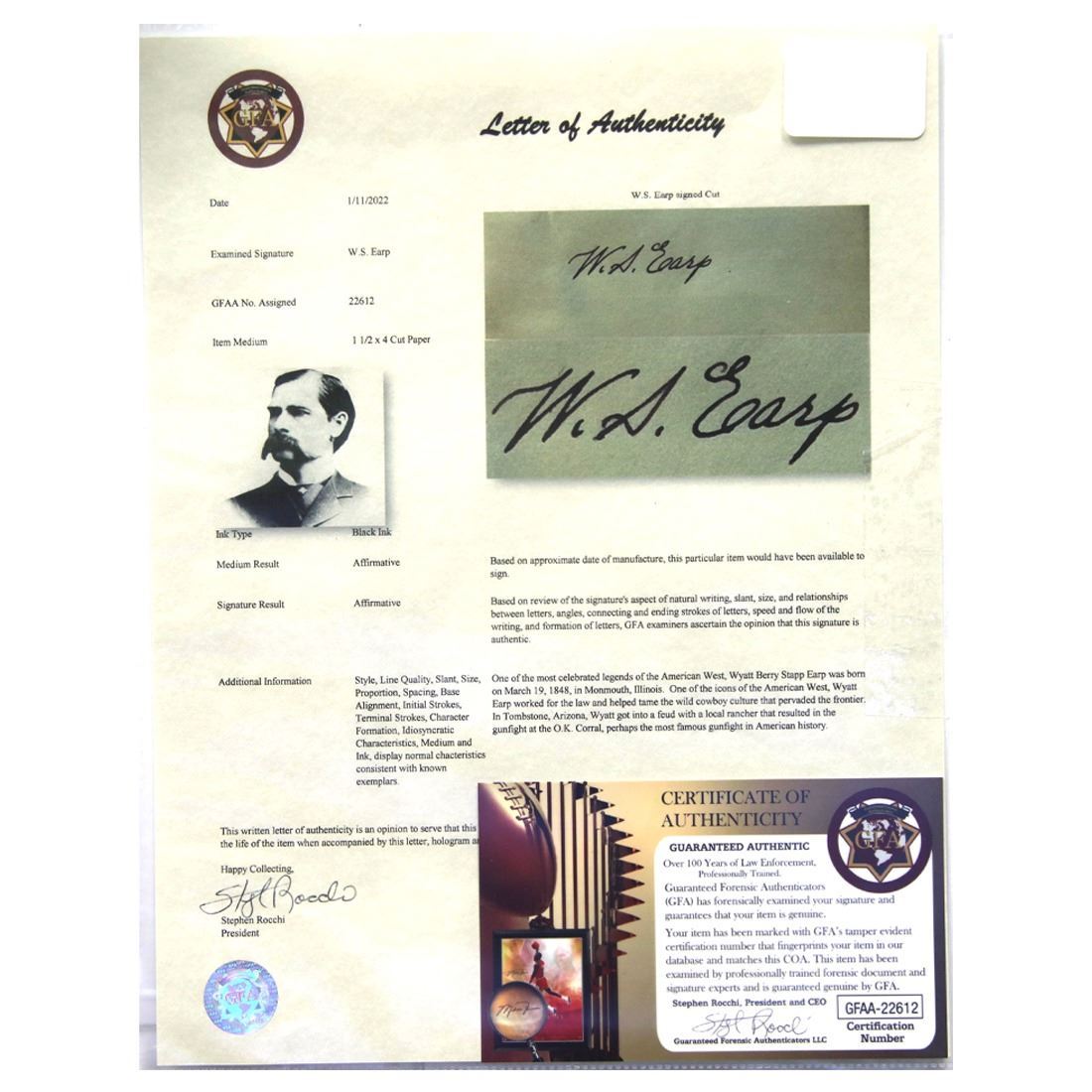 W.S. (Wyatt) Earp (1848-1929) signed 1.25 X 4 clipped signature, Boldly signed in black ink W.S. Earp. One of the icons of the American West, Wyatt Earp worked for the law and helped tame the wild cowboy culture that pervaded the frontier. In Tombstone, Arizona, Wyatt got into a feud with a local rancher that resulted in the gunfight at the O.K. Corral, perhaps the most famous gunfight in American history. Professionally custom Matted and Framed. Comes with a Letter of Authentication from Guaranteed Forensic Authenticators (GFA), along with the GFA guarantee of authenticity.
