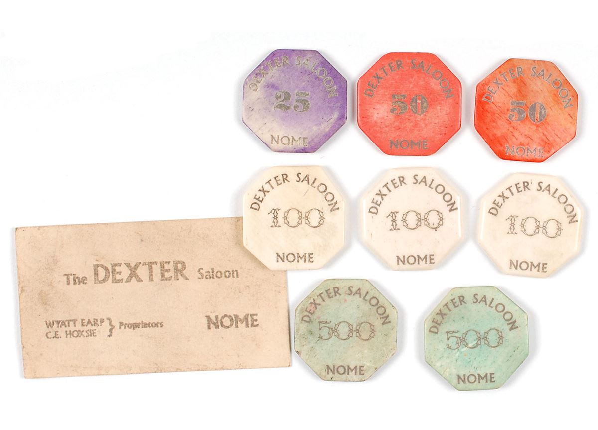 Collection of eight bone gambling chips from the Dexter Saloon in various colors and denominations, measuring approximately 1.5? in diameter, including two “500” green chips, three “100” white chips, two “50” red chips, and one purple “25” chip. Each bears the denomination etched on both sides, with one side reading “Dexter Saloon, Nome.” Also includes a 3.5 x 2 Dexter Saloon business card naming Earp and his partner C. E. Hoxsie as the proprietors. In fine condition, with various scratches and scuffs as expected with used chips. Excited by the prospect of the Klondike gold rush, Earp moved to Alaska and built the Dexter Saloon in 1899. Business flourished with the influx of treasure hunters and Earp returned to California in 1901, having become rich through his successful business venture. A highly desirable set of these extremely rare relics from Earp’s saloon. Originates from the Dan Hardesty Wild West Museum collection.