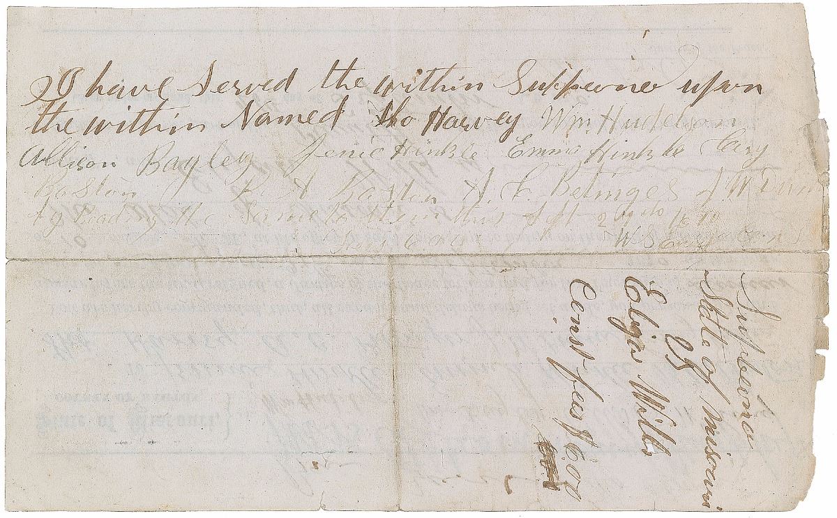 Sought-after early partly-printed DS, signed “W. S. Earp, Const.,” one page, 8.5 x 5.25, September 26, 1870. Subpoena from the state of Missouri issued to William Hudelson, Allison Bayley, Jennie Hinkle, Emma Hinkle, B. A. Boston, Thomas Harvey, A. C. Pettinger, J. W. Dunn, and Carry Boston, commanding them to appear before “a Justice of the Peace within and for the Township of Lamar in the County of Barton…at the hour of 10 o’clock…to testify on the trial of a case wherein The State of Missouri is plaintiff, and Elijah Wills is defendant.” Signed on the reverse by Earp, who writes, “I have served the within Suppena [sic] upon the within named Tho. Harvey…[Earp writes out the remaining witness names, with legibility diminished due to gradually reduced ink flow]…by reading the same to them this Sept. 27th, 1870, Fees 6.00.” Reverse is also docketed in an another hand. In very good to fine condition, with tissue reinforcement to right edge, and Earp’s handwriting quite light but fully readable.