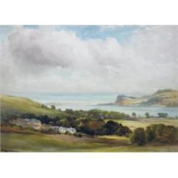 Wycliffe Egginton RI RWS (1875-1951) LANDSCAPE WITH COASTAL VILLAGE AND PIER signed lower left watercolour on paper 53 by 74cm., 21 by 29in.