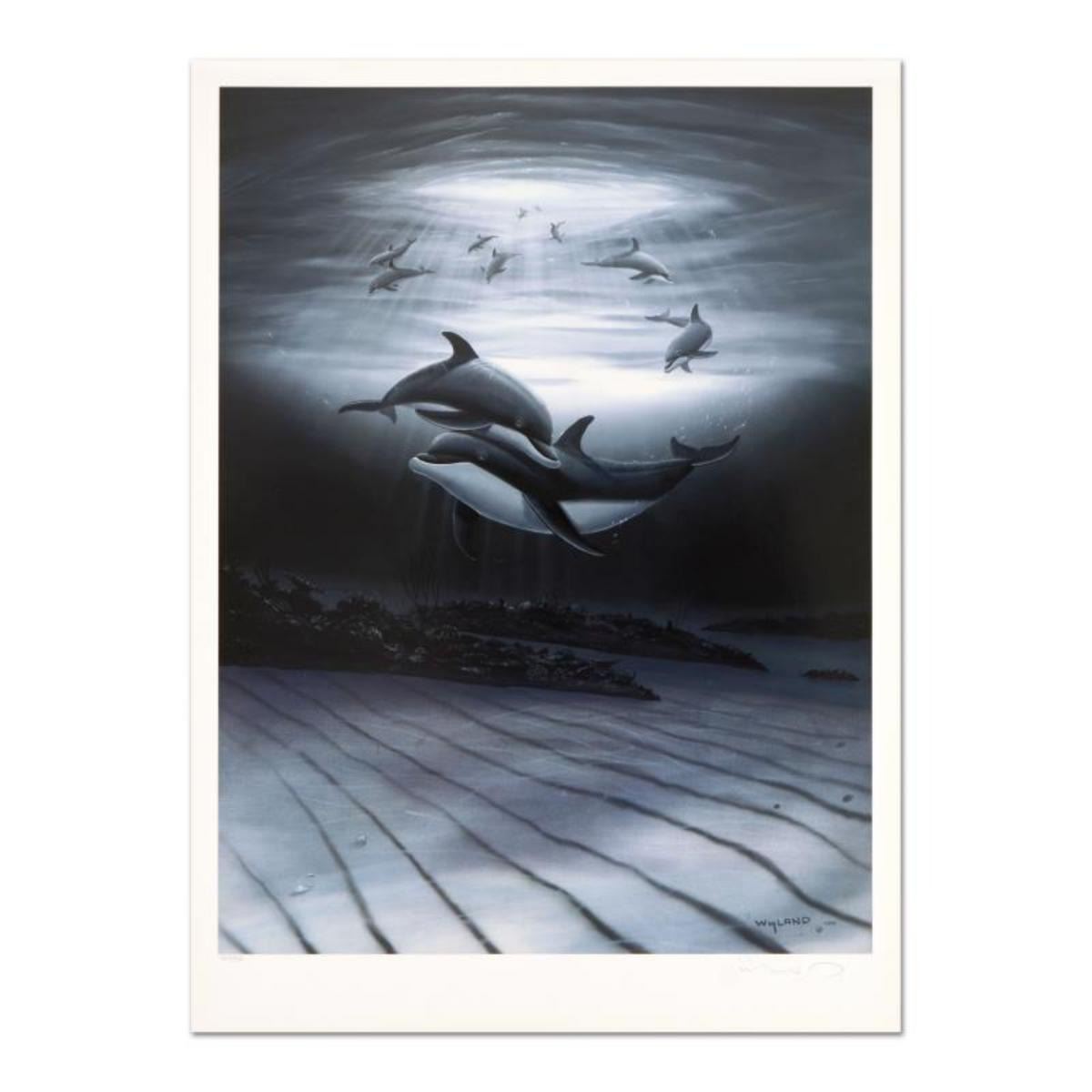 "Dolphin Affection" is a limited edition lithograph on paper by Wyland, numbered and hand signed by the artist. Includes Certificate of Authenticity. Measures approx. 18.5" x 26" (border), 16" x 21.5" (image). Reference #: 232786.