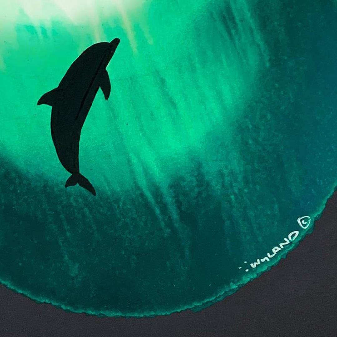 "Dolphin in Green" is an original painting, watercolor on deckle edge paper by Wyland. Hand signed by the artist, the piece comes custom framed and with a letter of authenticity. Measures approximately 30" x 30" (framed), 19.5" x 19.5" (image).