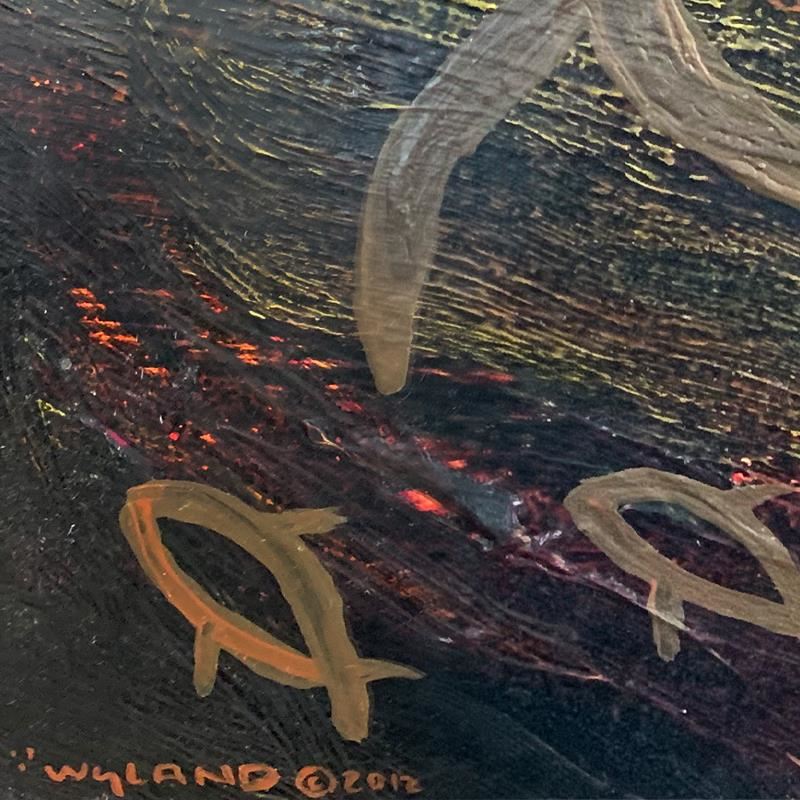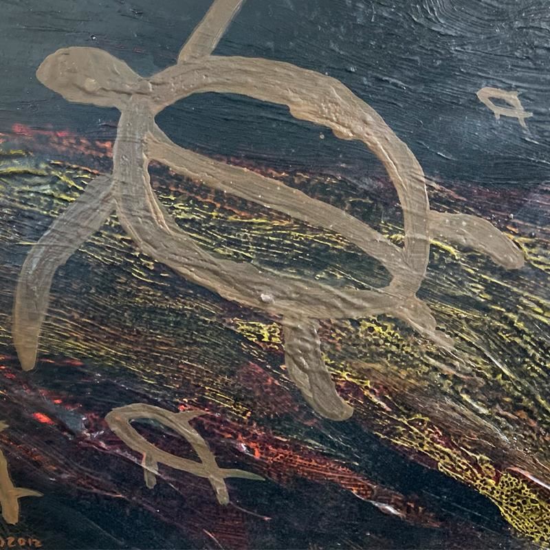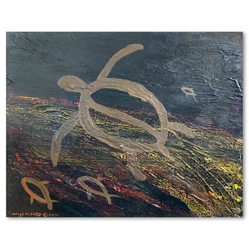 "Honu with Fish" is an original painting on board by Wyland. Hand signed by the artist, this piece includes a letter of authenticity. Measures approximately 16" x 20".