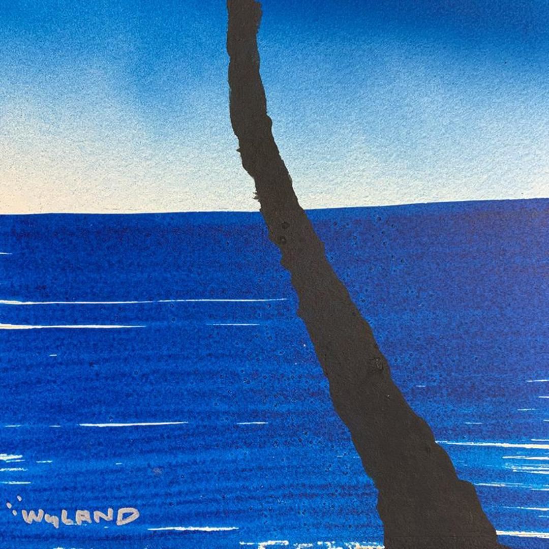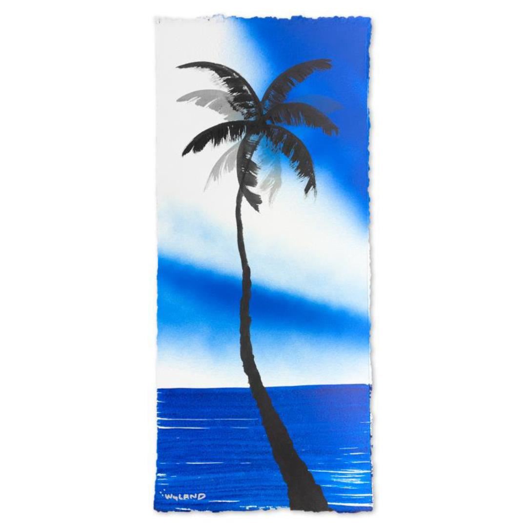 "Palm Trees" is an original painting acrylic on deckle edge paper by Wyland. Hand signed by the artist, the piece comes custom framed and with a letter of authenticity. Measures approximately 26.5" x 14.5" (framed), 22.5" x 10.5" (image). This item requires special handling and may have a longer than usual turnaround