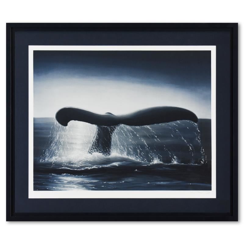 "Save the Whales" is a SOLD OUT limited edition serigraph on art paper by Wyland, numbered and hand signed by the artist. This piece comes framed. Includes Letter of Authenticity. Measures approx. 41.5" x 34" (frame), 32" x 24" (image). There is very minor wear on the corners and edges of the frame that is only noticeable upon close inspection.