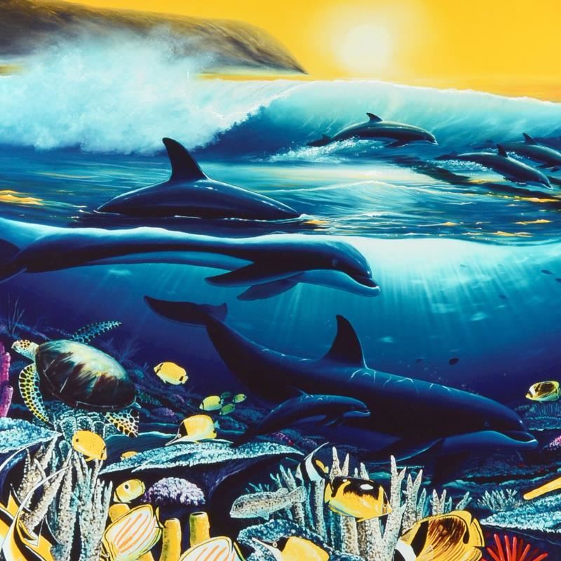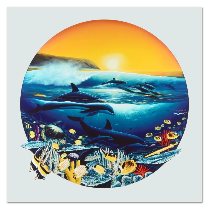"Surfing" is a hand-embellished limited edition cibachrome, AP numbered and hand signed by Wyland. Includes Certificate of Authenticity and Measures approximately 35" x 35" (image). Due to the nature of these pieces there may be some imperfections along the edges that would be concealed when framed and due to the glossy surface there may be some smudging in the signature and number area.