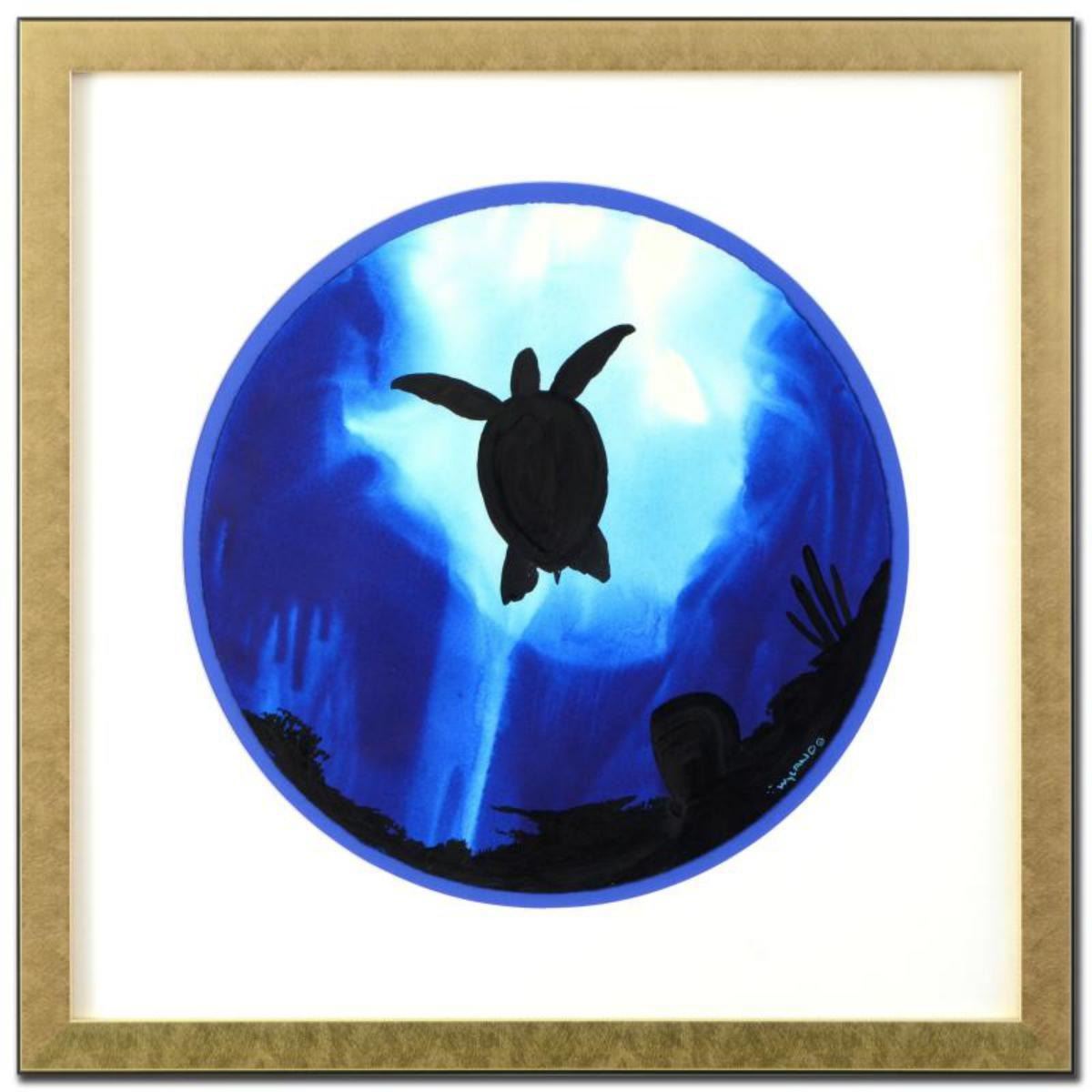 "Turtle (Blue)" is an original watercolor painting on round cut deckle edge paper by Wyland, hand signed by the artist! This piece is custom framed. Includes Certificate of Authenticity! Measures approx. 30" x 30" (frame), 19" (image diameter). Reference #: 218427