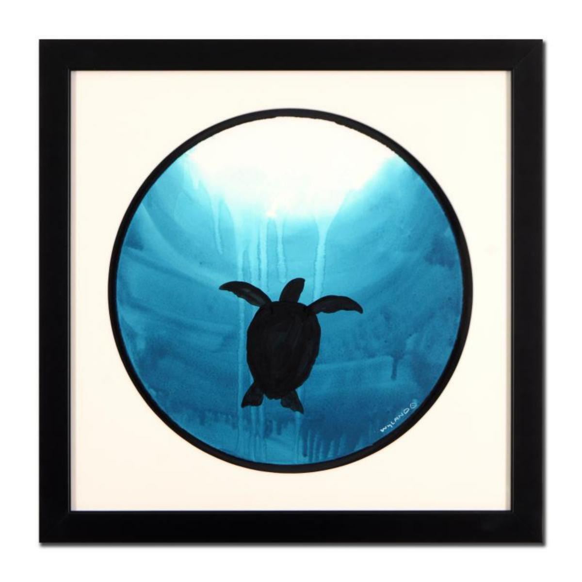 "Turtle" is an original watercolor painting on round cut deckle edge paper by Wyland, hand signed by the artist. This piece is custom framed. Includes Certificate of Authenticity. Measures approx. 28.5" x 28.5" (frame), 19" (image diameter). Reference #: 226065