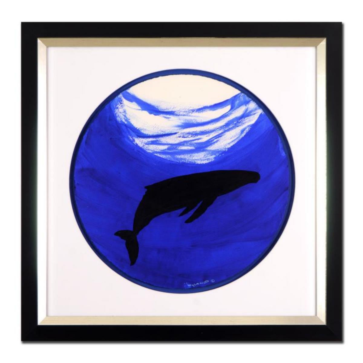 "Whale" is an original watercolor painting on round cut deckle edge paper by Wyland, hand signed by the artist. This piece is custom framed. Includes Certificate of Authenticity. Measures approx. 29.5" x 29.5" (frame), 19" (image diameter). Reference #: 226102
