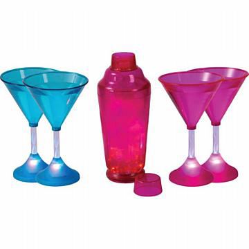 Wyndam House 5pc LED Drink Mixing Set **|**|** Set includes: one polypropylene luminescent martini shaker and 4 luminescent martini glasses. Features various light settings. Shaker stands 8-1/2" tall, 2-1/2" in diameter at base, glasses stand 6-1/2" tall, 2-3/4" in diameter at base. Requires 3 LR44 batteries (included)