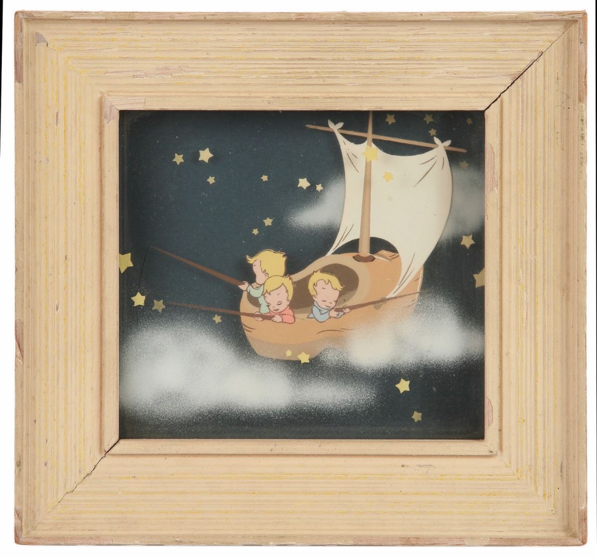 (Courvoisier, 1940s) This multiplane painting titled "Wynken, Blynken, and Nod" from Walt Disney's Silly Symphony was produced by Courvoisier Gallery in the 1940s as a celebration of Walt Disney Production's famous Multiplane technique, in which images are hand-painted on separate pieces of glass in order to add mystery and depth to the picture. This painting features Wynken, Blynken, and Nod, and is a beautiful piece of hand-painted Walt Disney animation art. This painting comes in its original Courvoisier frame with the original descriptive label on the reverse. Measures 8"x8.5"x1.5" in frame. In fine condition with expected wear to the frame.