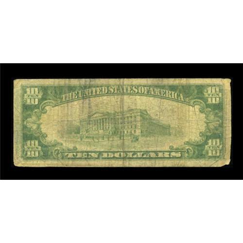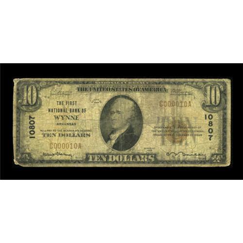 <B>Wynne, AR</B></I> - $10 1929 Ty. 1 <B>The First NB</B></I> Ch. # 10807<BR> Serial number ten graces this rare example from a bank with only two small size notes known. In the Kelly census no serial number is listed for the Type 1 $10, but we are fairly certain this is the note in his census. Well circulated with soiling and rounded. <B>Good</B></I>.<BR><I>From The Kansas City Collection.</B></I><BR><BR><b>Shipping:</b> Coins & Currency (<a target="_blank" href="http://www.heritageauctions.com/common/shipping.php">view shipping information</a>)