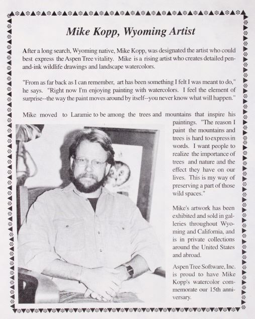 For your consideration is this rare Mike Kopp watercolor print entitled, "Wyoming Colors". Wyoming artist, Mike Kopp, had been commissioned by Aspen Tree Software, Inc. to create a work in celebration of the firm's 15th Anniversary in 1992. The watercolor features an aspen tree in fall color against the backdrop of Wyoming mountains and a river; in the foreground are more aspen trees. The work is signed by the artist and attractively framed and matted. Attached to the back of the frame is an Artist Bio and a Certificate of Authenticity. The certificate provides the name of the person to whom the print was originally registered, as well as a guarantee that the total number of prints would be limited to 100. The piece is in excellent condition; the print inside the frame measures 15.5" x 21", total measurements are 27" x 32".
