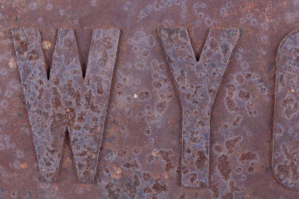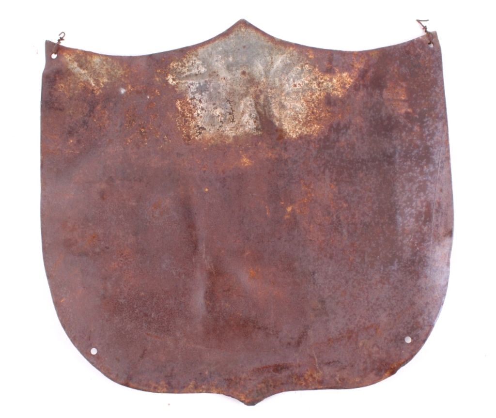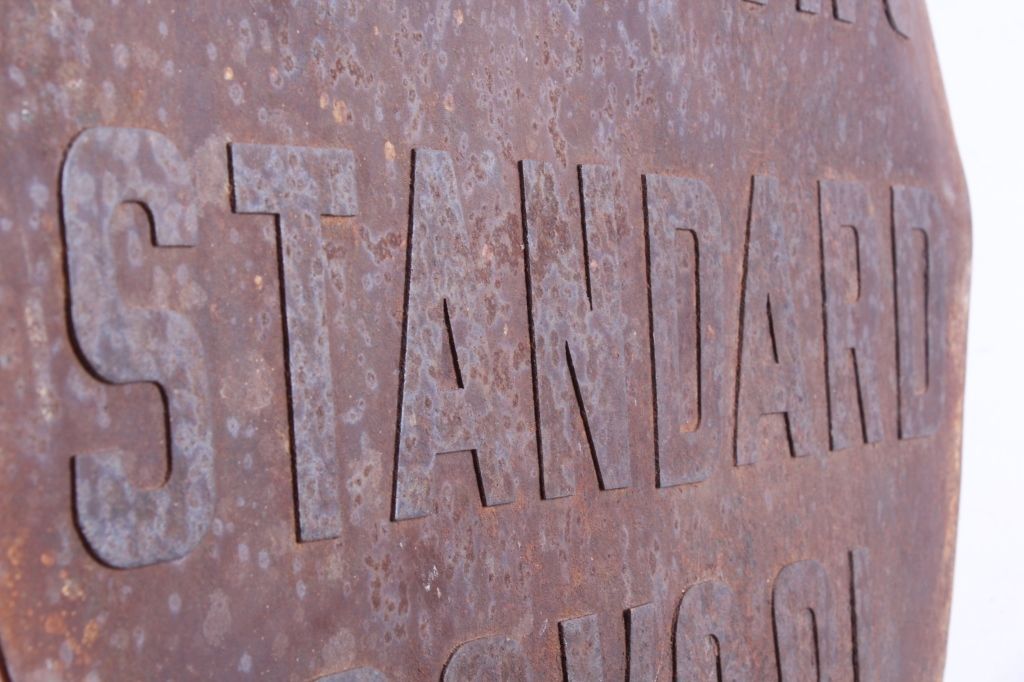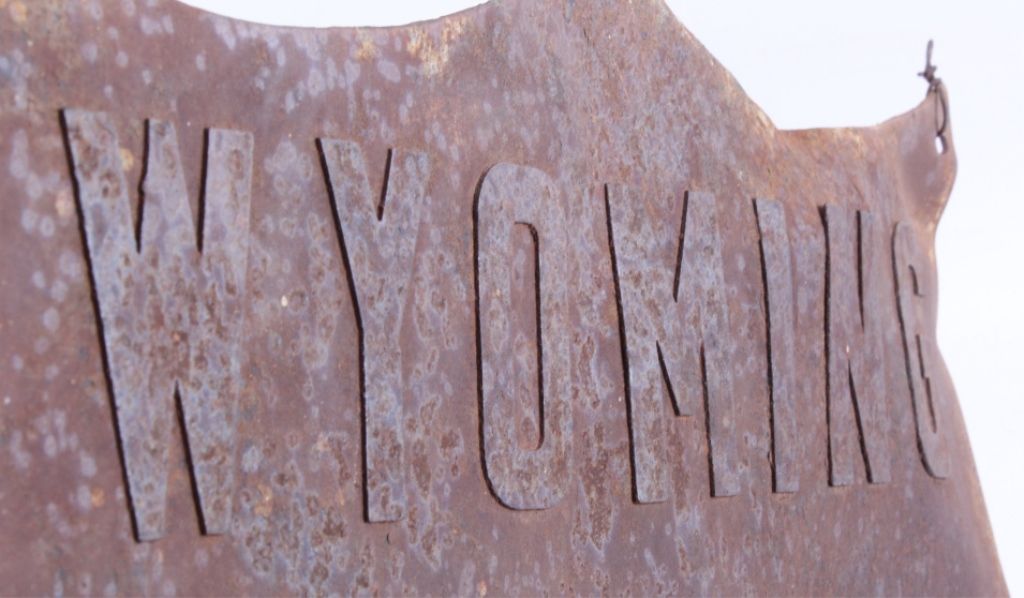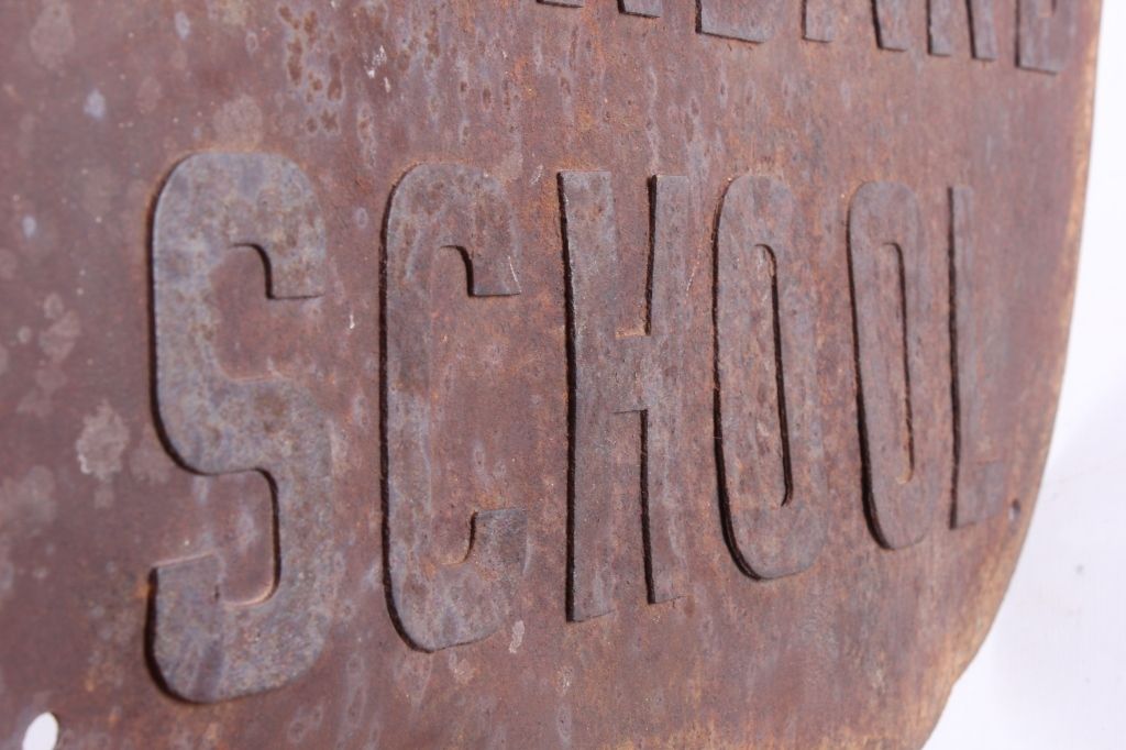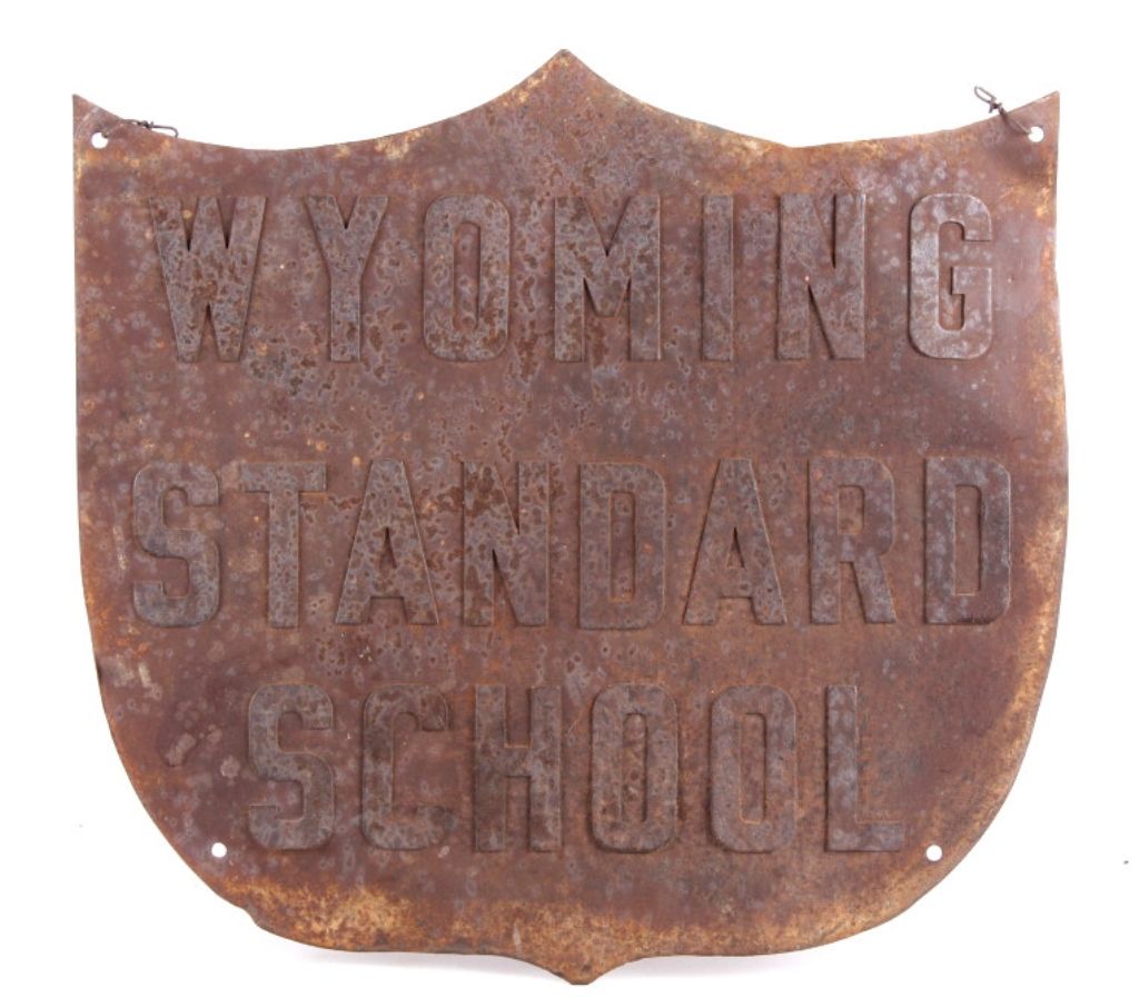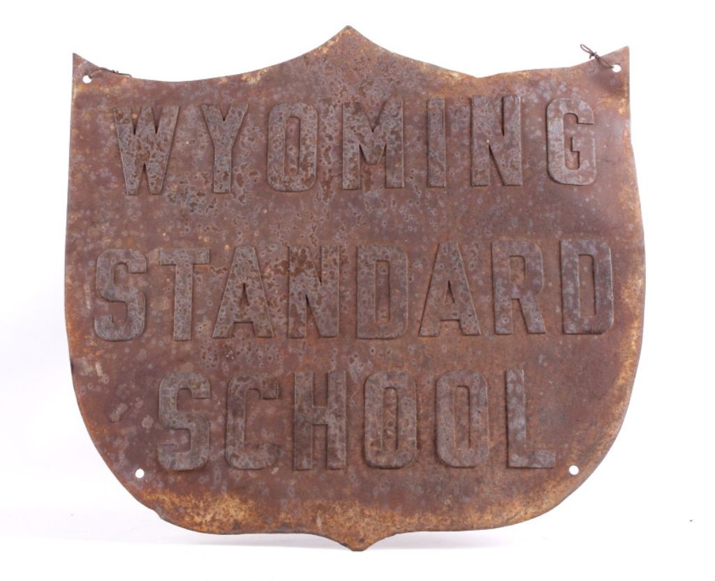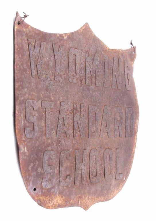 This is a original rare early antique sign showing applied metal embossed lettering. The piece reads, "Wyoming Standard School" and is in a shield shape. Circa 1800's. Measures 17"x18"
