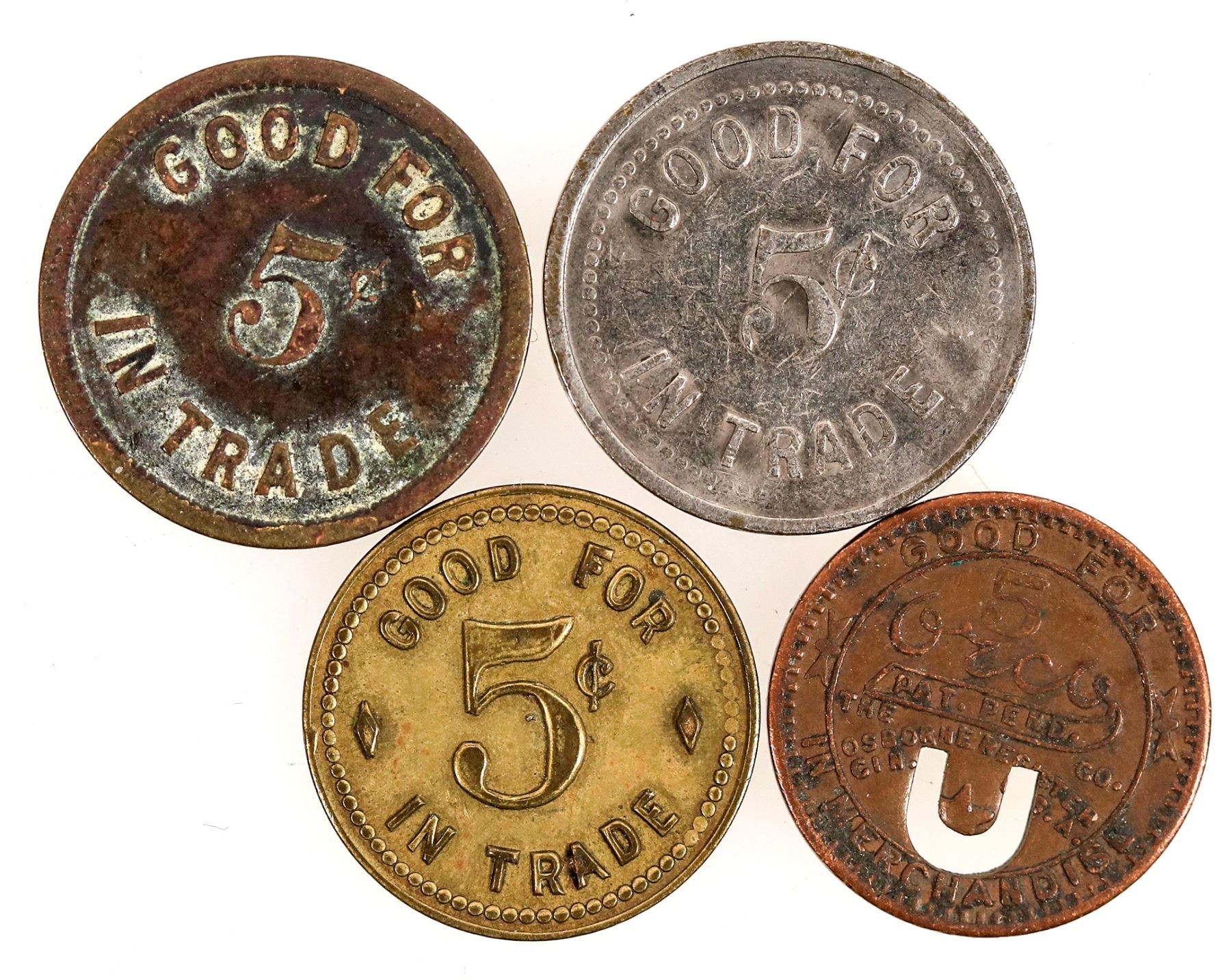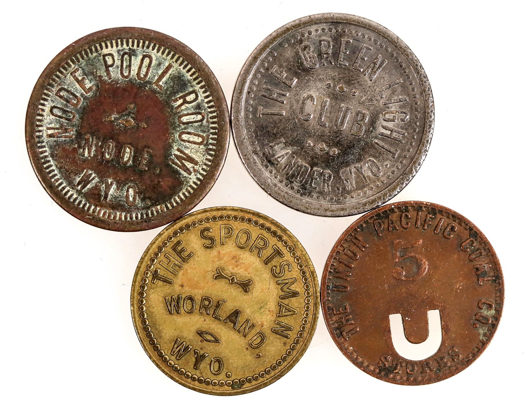 Four different Wyoming tokens: 1) THE GREEN LIGHT / CLUB / LANDER, WYO. // GOOD FOR / 5c / IN TRADE; Wm, rd., 21 mm. 2) Union Pacific Coal Company Stores; Br., rd., 19 mm, "U" cut out. 3) THE SPORTSMAN / WORLAND, / WYO. // GOOD FOR / 5c / IN TRADE; Br., rd., 19 mm. 4) NODE POOL ROOM / NODE, / WYO. // GOOD FOR / 5c / IN TRADE; Br., rd., 21 mm.