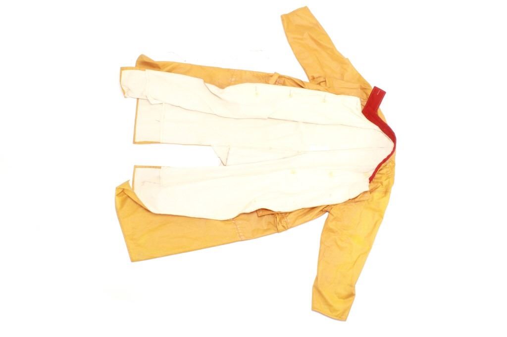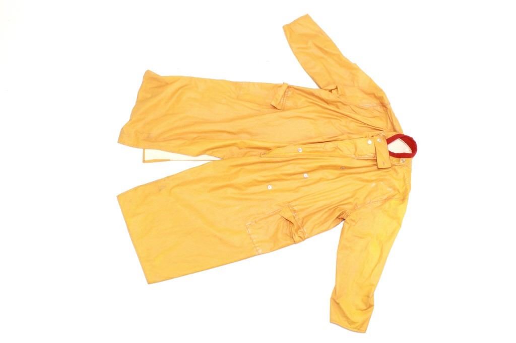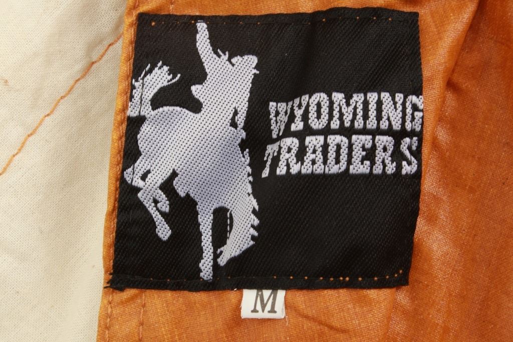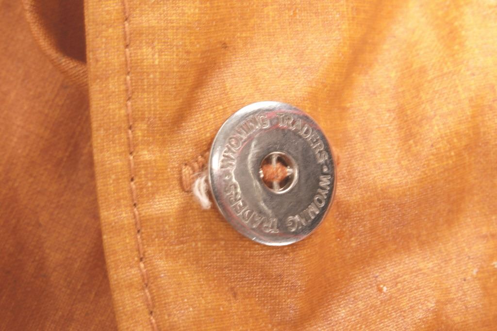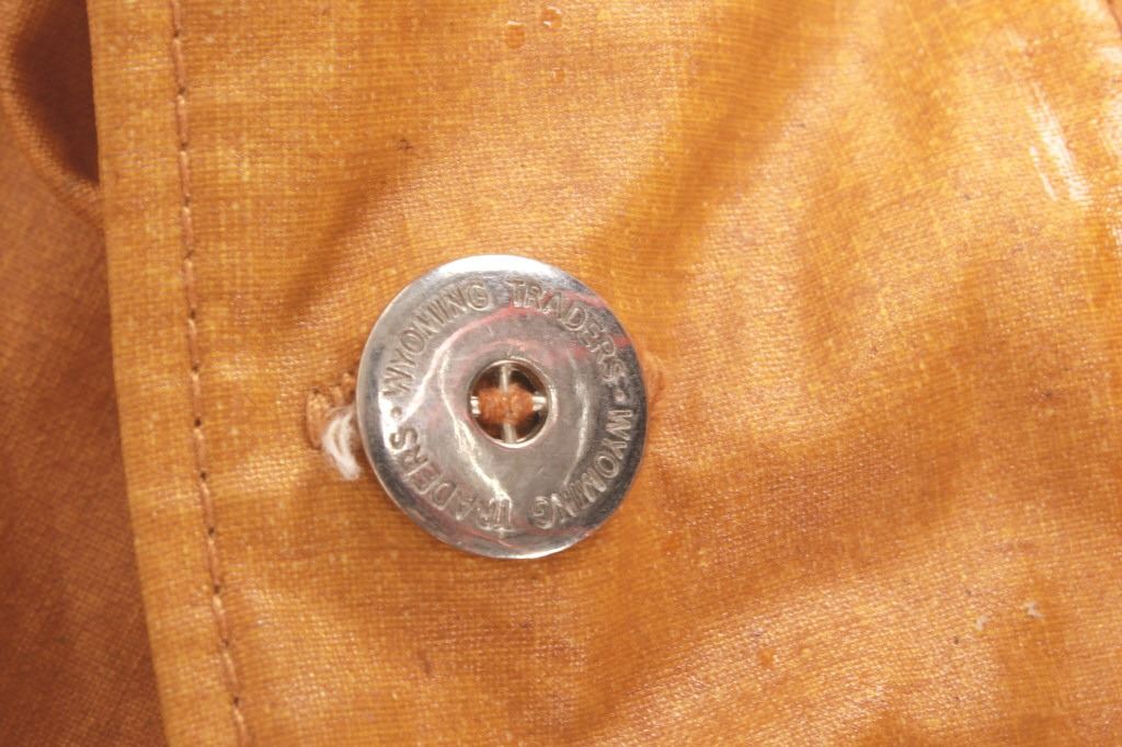 Featured in this lot is this Wyoming Trader pommel fish acrylic latex slicker. The slicker features a waterproof acrylic latex coated muslin and has been sealed with reinforced stitching throughout. The fish slicker is lined with muslin and is lightweight and features buttons that read, “Wyoming Traders”. The condition of this slicker is good, with wear consistent with light use. The slicker is a size medium with overall laid out measurements of 50" long and 20" in the shoulders.