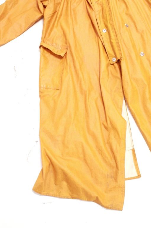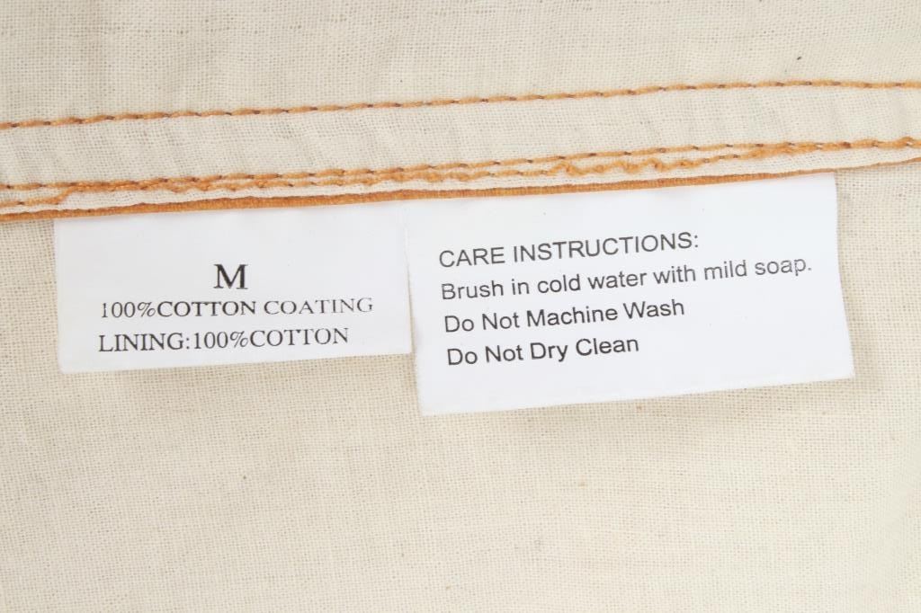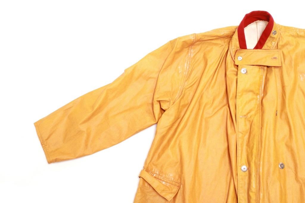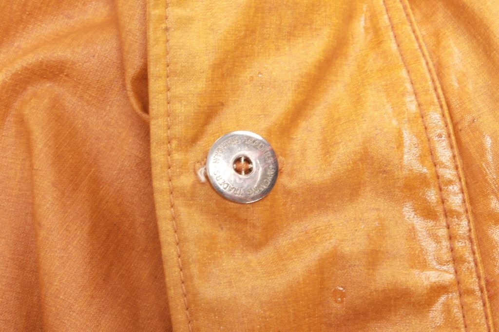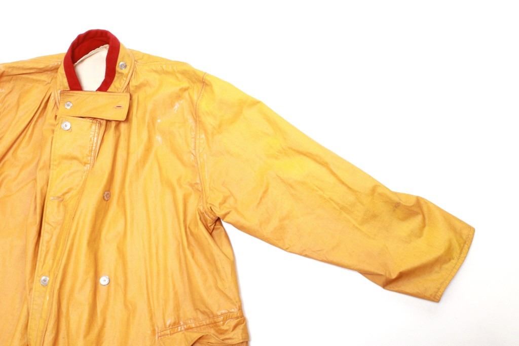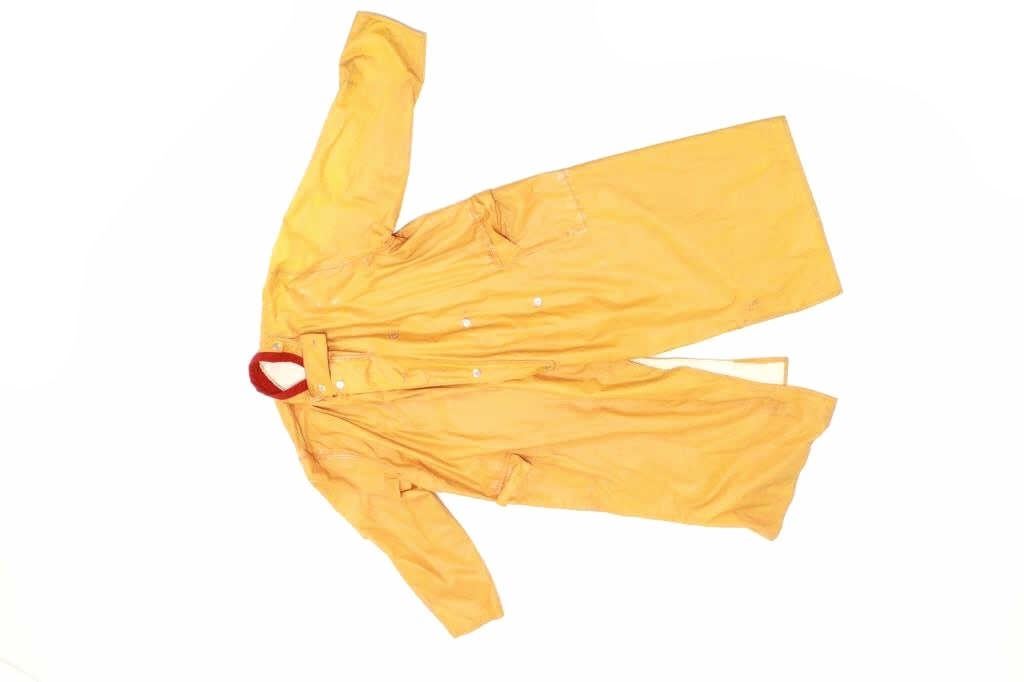 Featured in this lot is this Wyoming Trader pommel fish acrylic latex slicker. The slicker features a waterproof acrylic latex coated muslin and has been sealed with reinforced stitching throughout. The fish slicker is lined with muslin and is lightweight and features buttons that read, “Wyoming Traders”. The condition of this slicker is good, with wear consistent with light use. The slicker is a size medium with overall laid out measurements of 50" long and 20" in the shoulders.