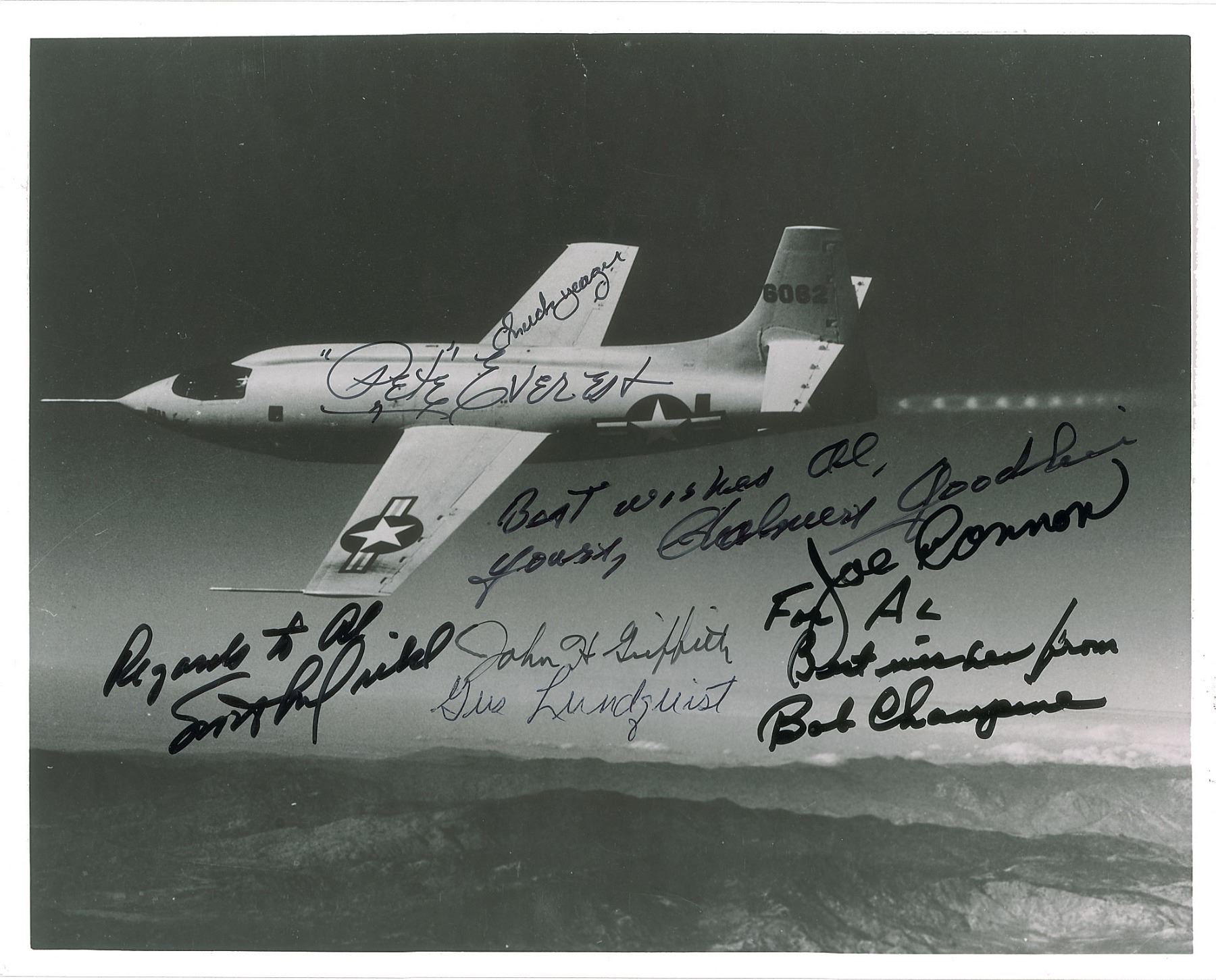 Glossy 10 x 8 photo of the Bell X-1 rocket plane 'Glamorous Glennis,' signed in black felt tip by Chuck Yeager, Pete Everest, Scott Crossfield, Chalmers Goodlin (ins), John H. Griffith, Gus Lundquist, Joe Cannon, and Bob Champagne (ins), with two adding inscriptions to “Al.” In fine condition.