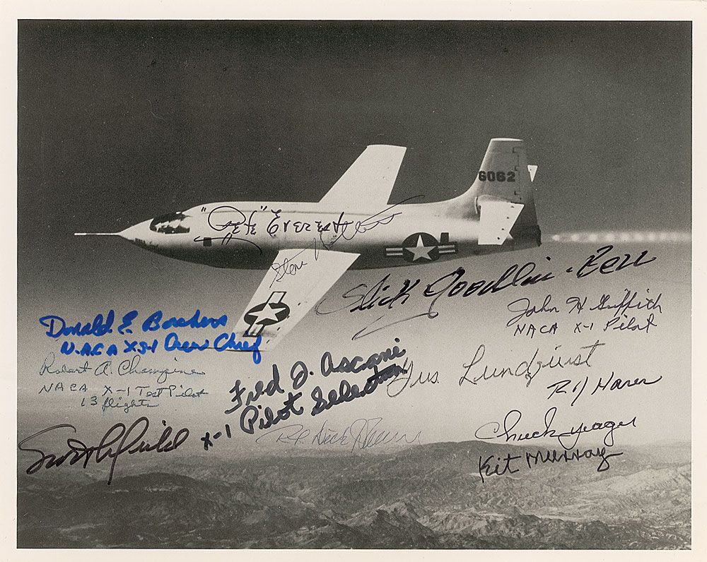 Satin-finish 10 x 8 NASA litho of an X-1 in flight, signed in various color ink and felt tip by 13 pilots, including: Chuck Yeager, Scott Crossfield, Pete Everest, Slick Goodlin, Kit Murray, Gus Lundquist, John H. Griffith, and Fred Ascani. In fine condition. Accompanied by a full letter of authenticity from Steve Zarelli.