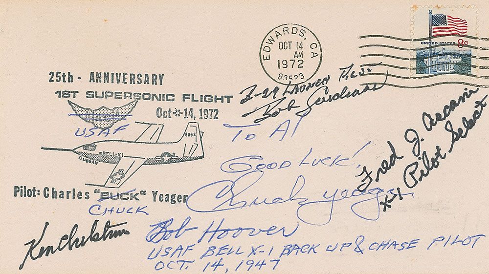 Commemorative cover with a cachet honoring Chuck Yeager’s first supersonic flight, signed ballpoint and felt tip by five pilots including Chuck Yeager (ins), Bob Hoover, and Fred Ascani. Yeager has also made two corrections to the cachet, including “Chuck,” under his name and “USAF.” In fine condition.