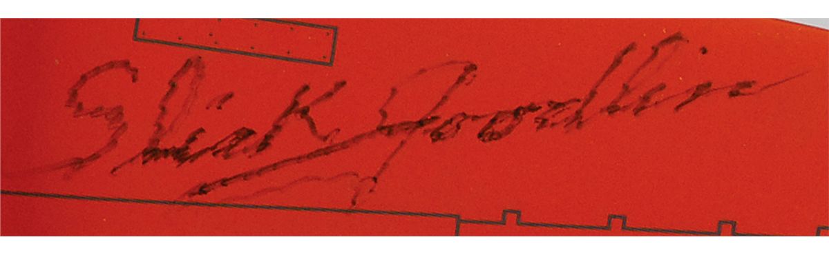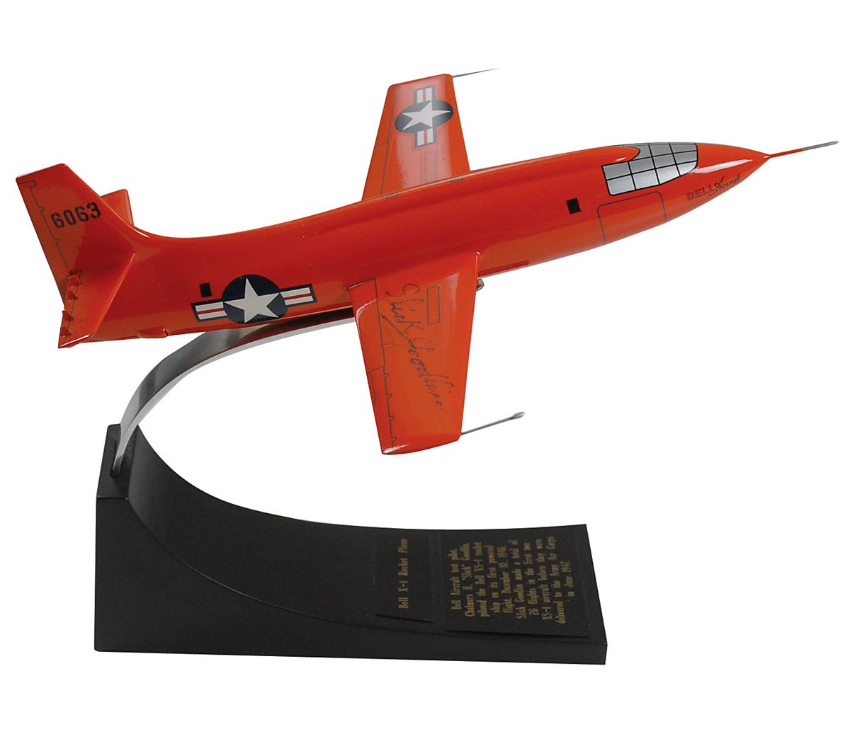 Second test pilot of the Bell X-1 supersonic rocket plane (1923–2005), and the first to operate the craft in powered flight. Well-done composite scale model of a Bell XS-1 jet, signed on the wing in black felt tip by Goodlin, post-stroke. Model is accompanied by its display stand. Signature uniformly light due to irregular ink adhesion, otherwise fine condition.