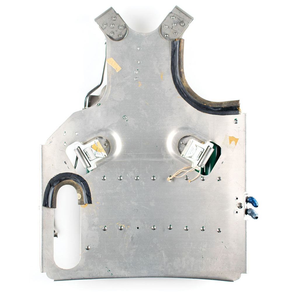 Internal support plate and tank for the backup oxygen supply backpack of the MC-2 pressure suit used by X-15 pilots, measuring approximately 17è x 21è x 3è, retaining a small amount of the tubing and two Air-Lock buckles on the front. The X-15 was designed with a sophisticated ejector seat that allowed safe pilot ejection at speeds as high as Mach 4 and altitudes up to 120,000 feet. The backup oxygen pack was activated as soon as the pilot pulled the ejection handles and provided enough oxygen for about twenty minutes. A parachute pack was also integrated into the suit and attached to the backpack. Although the MC-2 suit was only used on sixteen X-15 flights, it represented a breakthrough in suit technology and served as a model for spacesuits of the future.