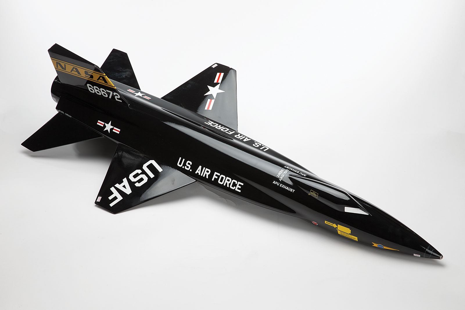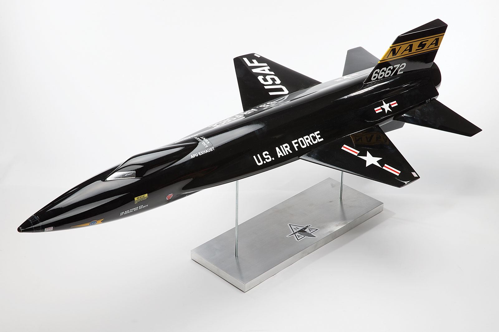 Fantastic 1:15 scale fiberglass model of a North American Aviation X-15 hypersonic rocket-powered aircraft, designated as "66672," measuring 40 x 18.5, featuring several accurate US Air Force, NASA, and component decals by Retro Rocket. Includes the original metallic display stand with North American Aviation logo. This model was built from molds originally created by noted special effects designer Gene Young of Burbank, California. This model was done as a tribute to Neil Armstrong's famous 'skip flight' where he almost missed landing at Edwards AFB and might have had to land at Los Angeles Airport. Fortunately as a skilled pilot, he made it back to Edwards. In fine condition.