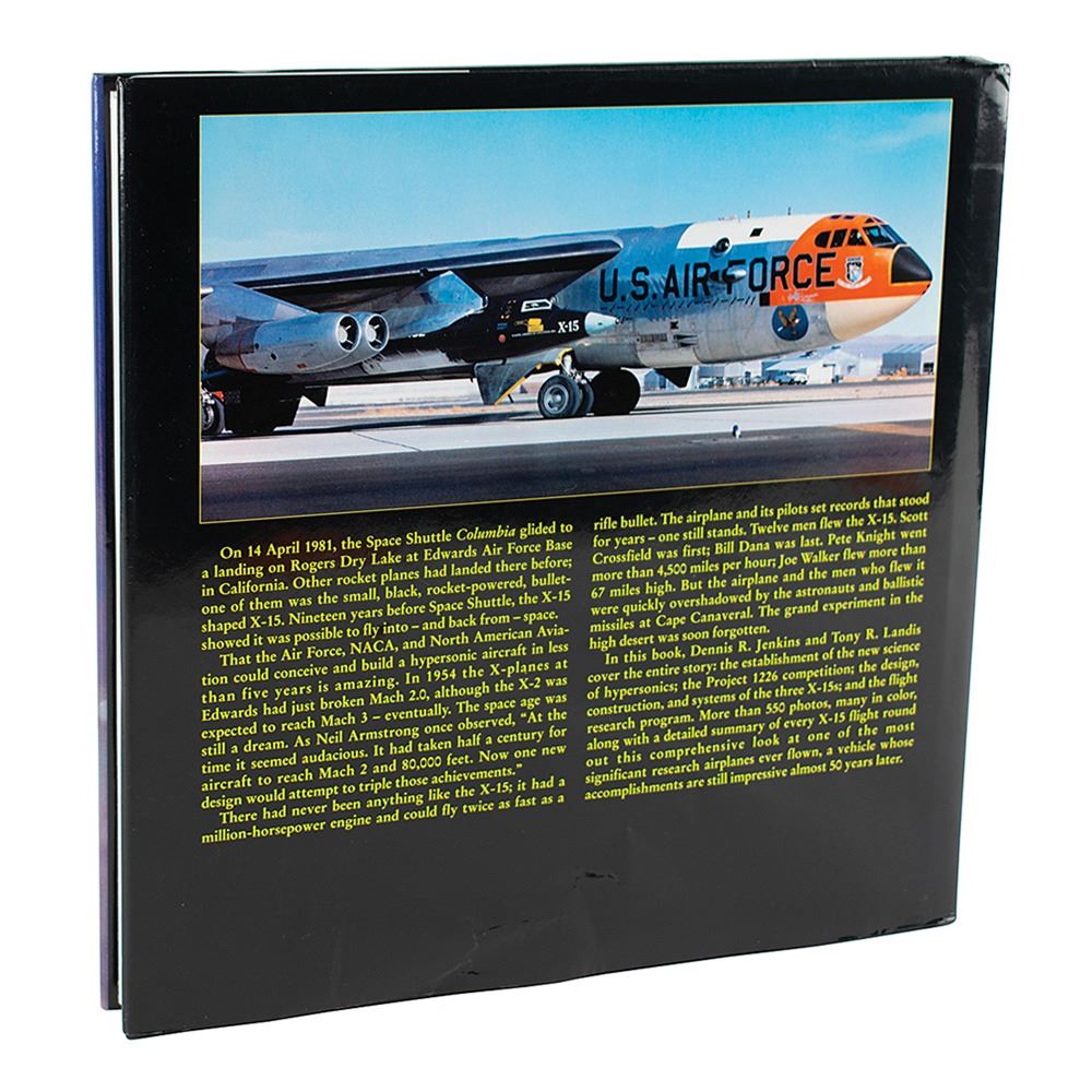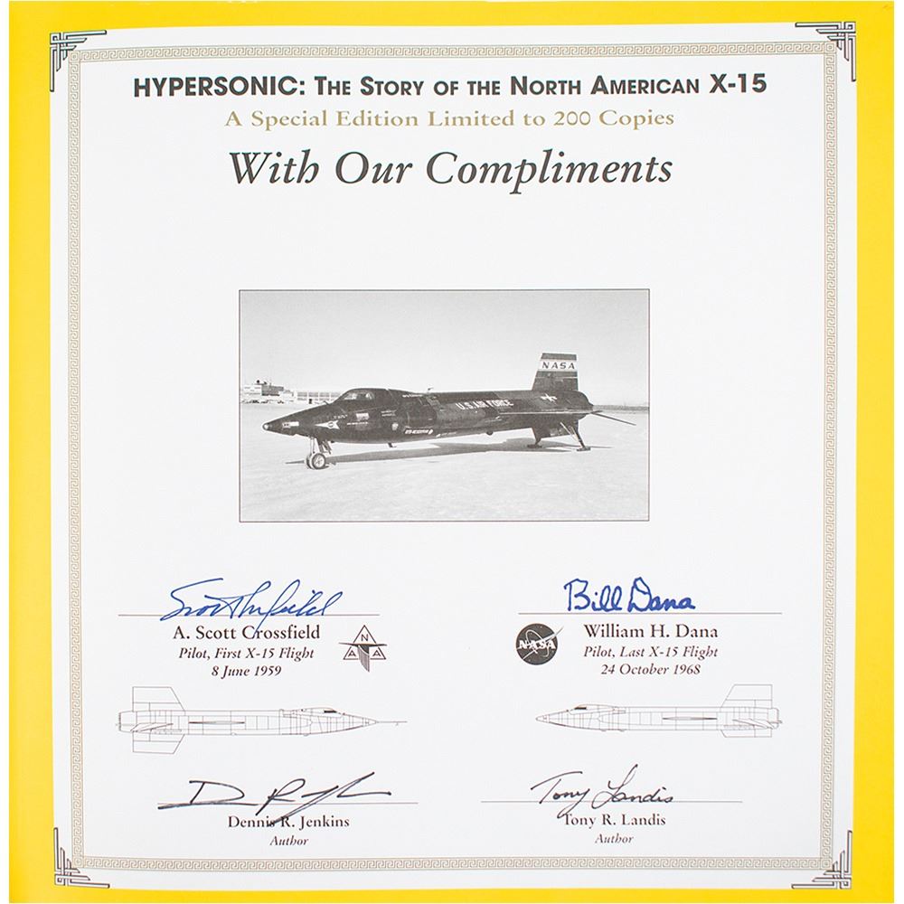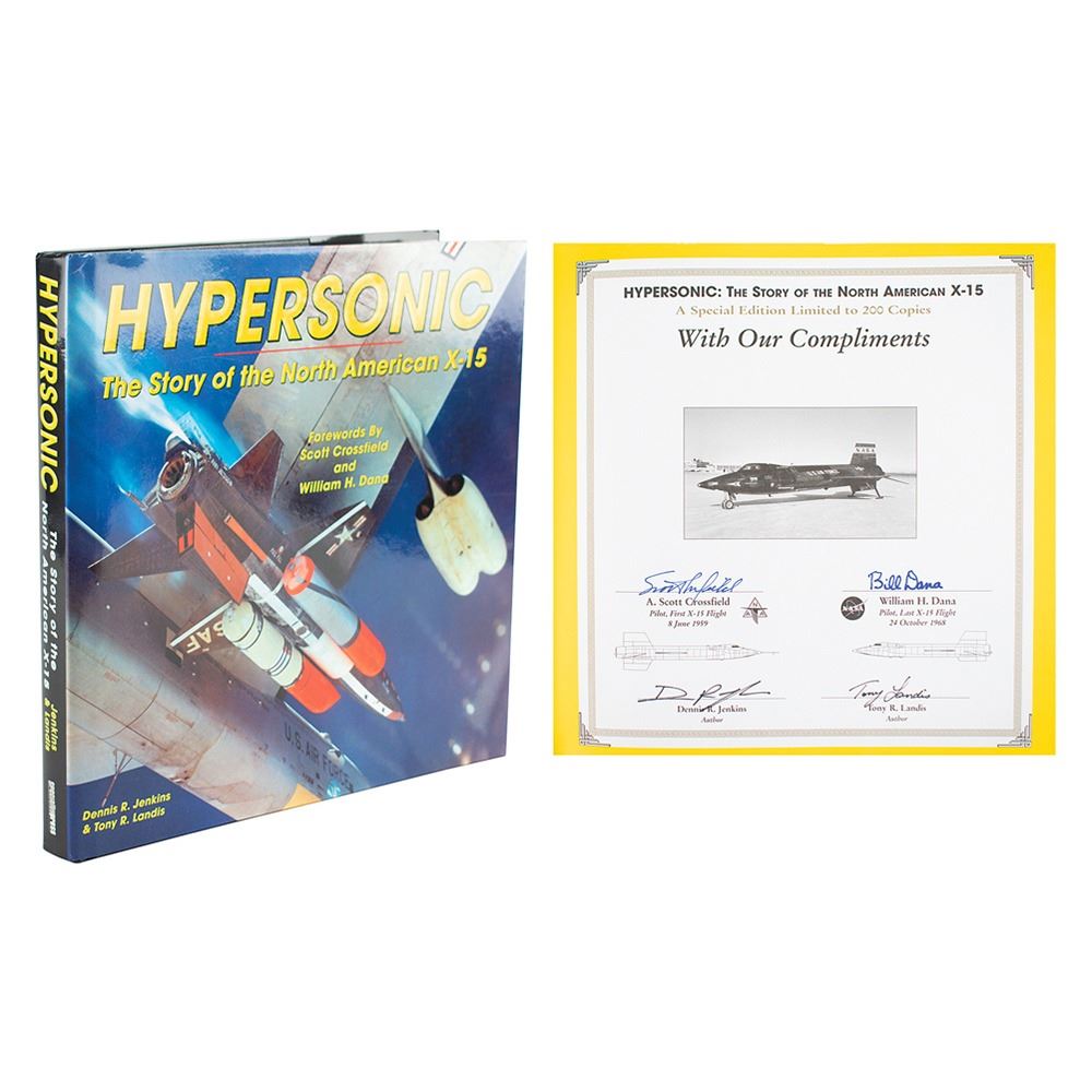 Signed book: Hypersonic: The Story of the North American X-15. Special edition limited to 200 copies. North Branch, Minnesota: Specialty Press, 2002. Hardcover with dust jacket, 10.5 x 10.25, 264 pages. Signed on the colophon in blue felt tip by Scott Crossfield and Bill Dana, both of whom supply opening forewords; the page is also signed by authors Dennis Jenkins and Tony Landis. In fine condition, with some creasing to lower back cover of dust jacket.