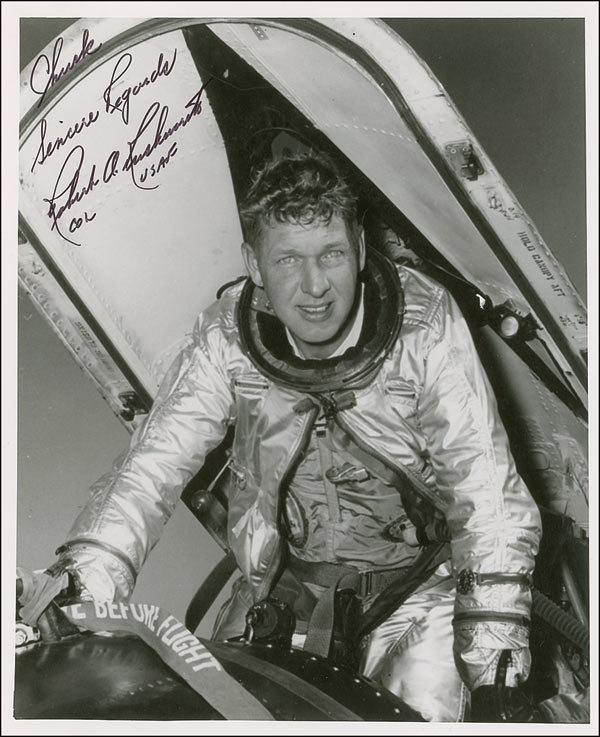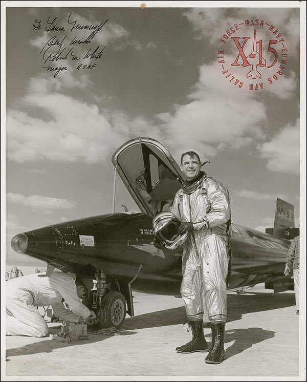 Two signed glossy 8 x 10 US Air Force publicity portraits of the first two X-15 pilots to attain the rank of astronauts, respectively signed and inscribed in black ink by Robert M. White and Robert A. Rushworth. White’s photo bears an X-15 red stamping at the top right corner. Scattered light creasing and spots of soiling, otherwise fine condition.