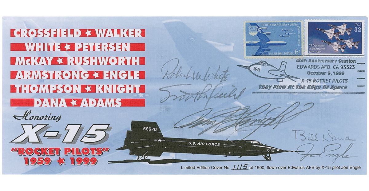 Limited-edition flown commemorative cover honoring the X-15 Rocket Pilots, #1115/1500, flown over Edwards AFB by X-15 pilot Joe Engle, signed in pencil by Robert White, Bill Dana, Joe Engle, Pete Knight, and Scott Crossfield. In fine condition. Accompanied by an informational cardstock sheet entitled, ‘Celebrating the 40th Anniversary of the X-15.’