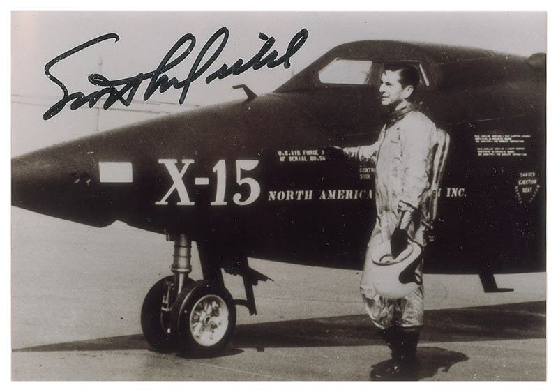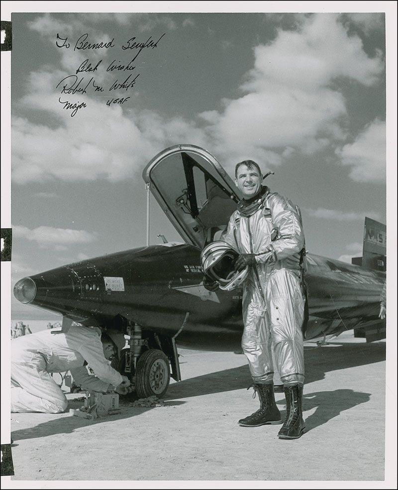 Vintage glossy 8 x 10 photo of Robert White dressed in his flight suit and standing next to his X-15, signed and inscribed in black ink, “To Bernard Senfert, Best wishes, Robert M. White, Major USAF”; and a glossy 5 x 3.5 photo of Scott Crossfield at the nose of his X-15, signed in black felt tip. A few surface marks and three partial binder holes and reinforcement to left edge of White’s photo, otherwise fine condition.