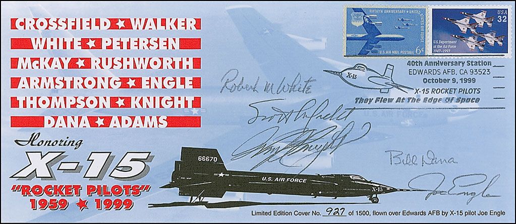 Flown limited edition commemorative cover, 9.5 x 4.25, #927/1500, with a cachet honoring the 12 X-15 pilots, signed on the front in pencil by five of the pilots: Scott Crossfield, Robert M. White, Bill Dana, William J. Knight, and Joe Engle. Cover was flown by Engle on the 40th Anniversary of the plane. In fine condition.