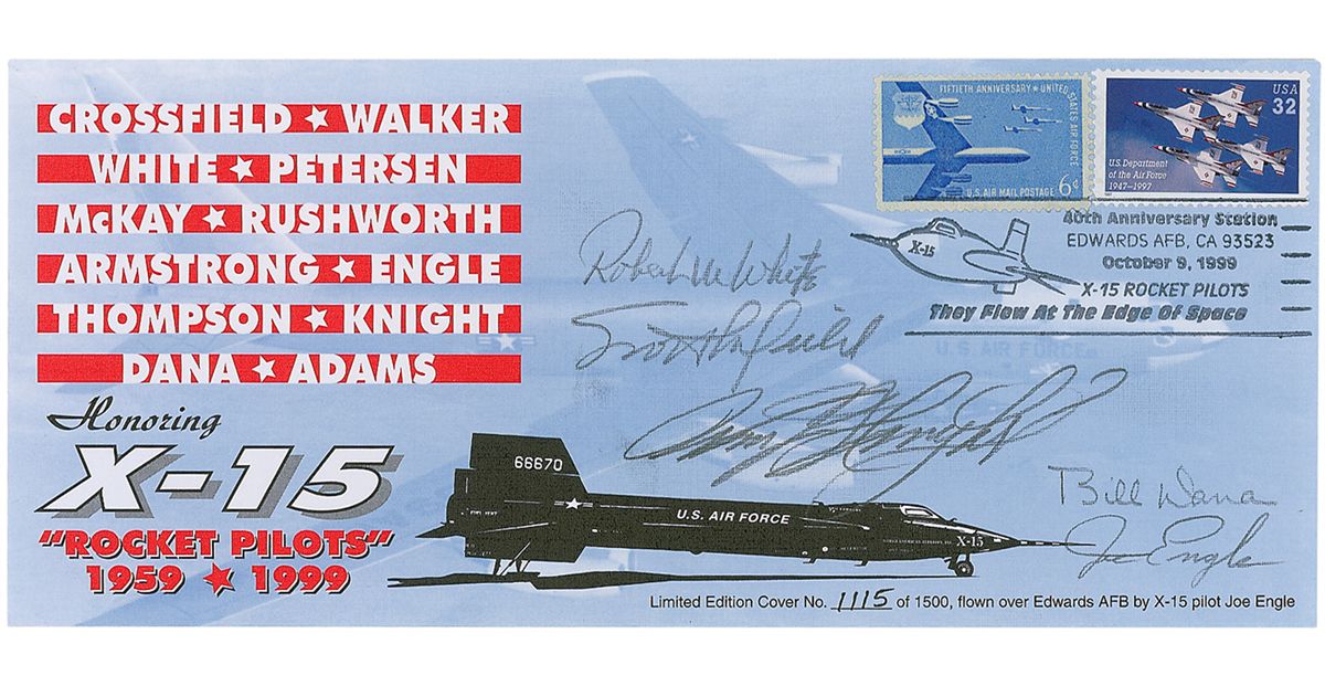Limited-edition flown commemorative cover honoring the X-15 Rocket Pilots, #1115/1500, flown over Edwards AFB by X-15 pilot Joe Engle, signed in pencil by Robert White, Bill Dana, Joe Engle, Pete Knight, and Scott Crossfield. In fine condition. Accompanied by an informational cardstock sheet entitled, ‘Celebrating the 40th Anniversary of the X-15.’