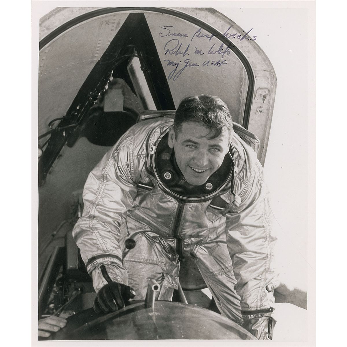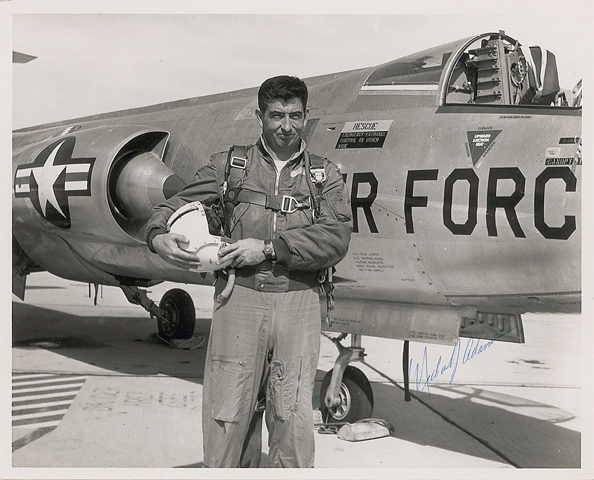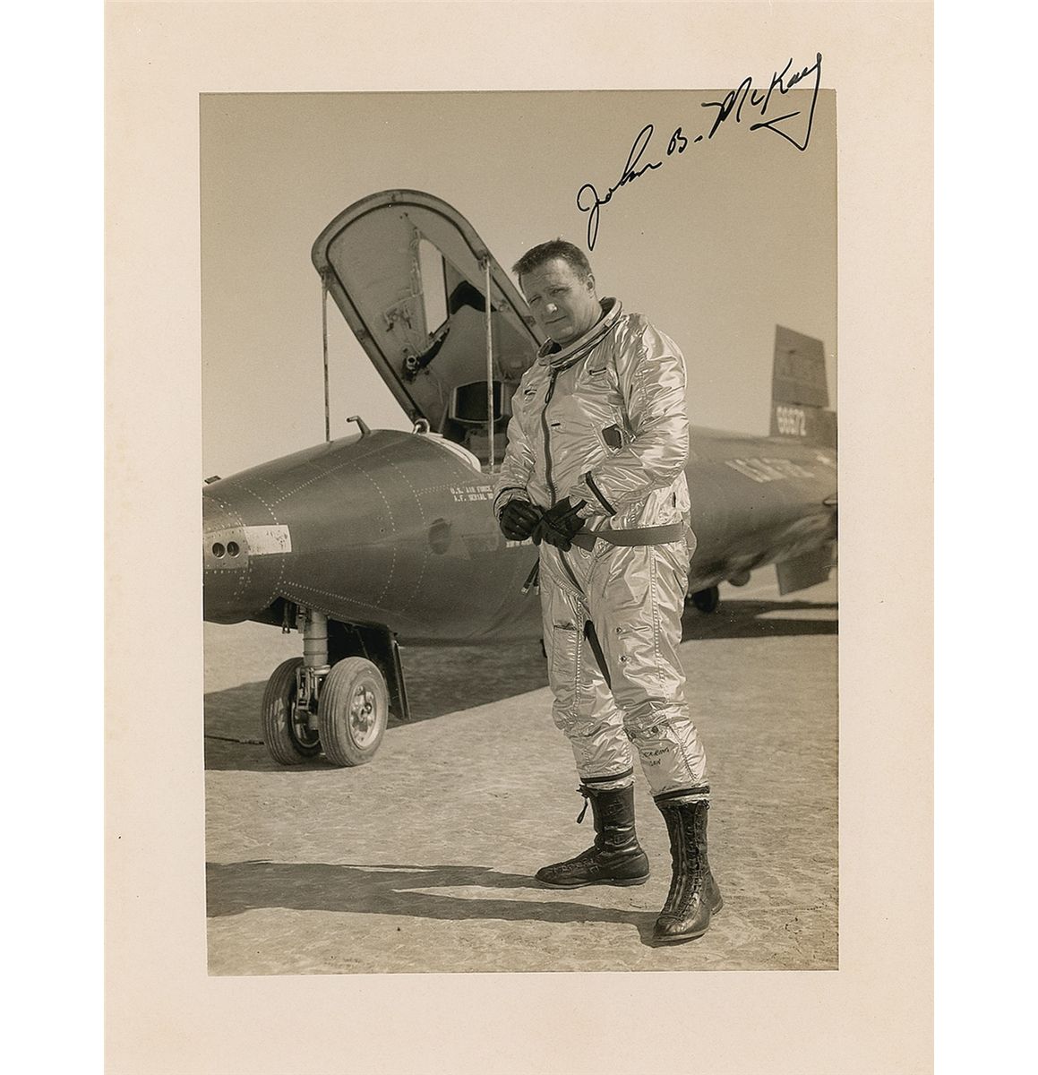 Amazing collection of 12 signed photos of the full roster of X-15 pilots, each measuring approximately 8 x 10 or 10 x 8: vintage glossy photo of Mike Adams in front of a US Air Force jet, signed in blue ballpoint, “Michael J. Adams”; glossy NASA photo of Neil Armstrong with his X-15, signed and inscribed in blue felt tip, “Best wishes to V. J. Nunes, Neil Armstrong”; glossy photo of Joe Walker posing at the cockpit of an X-15, signed in black ink; glossy photo of Scott Crossfield in his flight suit, signed in black felt tip; glossy NASA photo of Milt Thompson with an X-15, signed in black felt tip; glossy NASA photo of Joe Engle with an X-15, signed in black ink, “Joe Engle, Col. USAF”; color satin-finish photo of Bill Dana with an X-15, signed in black felt tip, “With my best wishes, Bill Dana”; glossy NASA photo of Robert White in the cockpit, signed in black felt tip, “Sincere best wishes, Robert M. White, Maj. Gen. USAF”; vintage glossy photo of John B. McKay in front of an X-15, signed in black ink; glossy photo of Forrest S. Petersen seated in the cockpit, signed in blue ink; glossy photo of Robert A. Rushworth, signed in blue felt tip; and a cardstock photo of William J. Knight, signed in black felt tip. In overall fine condition, with scattered surface bends and creases, and a few unobtrusive edge tears. The inclusion of the very rare Adams (1930–1967) makes this an especially remarkable collection—he was the first American space mission fatality, tragically passing in an accident where his X-15 entered a violent Mach 5 spin, causing the aircraft to break apart. Due to the rarity of Adams—especially in signed photo format—the opportunity to acquire a complete set of X-15 pilots rarely, arises.