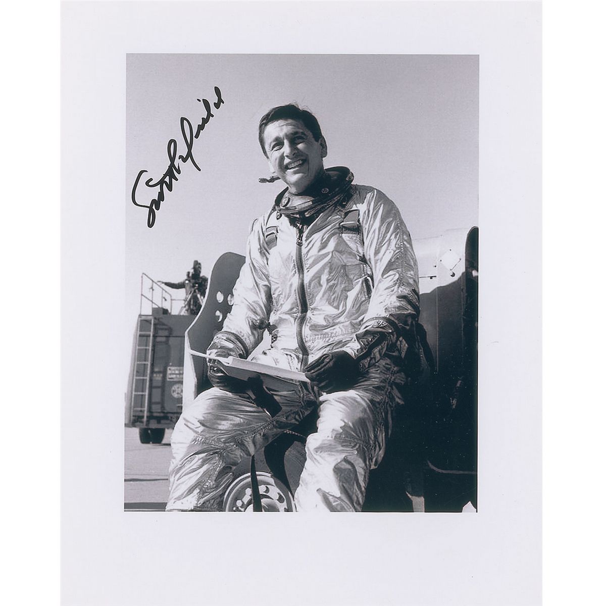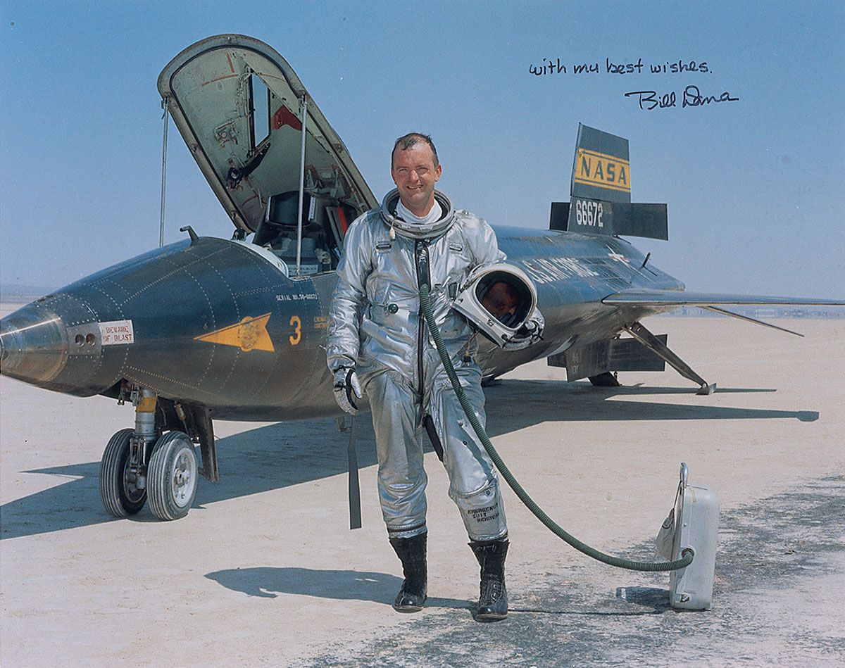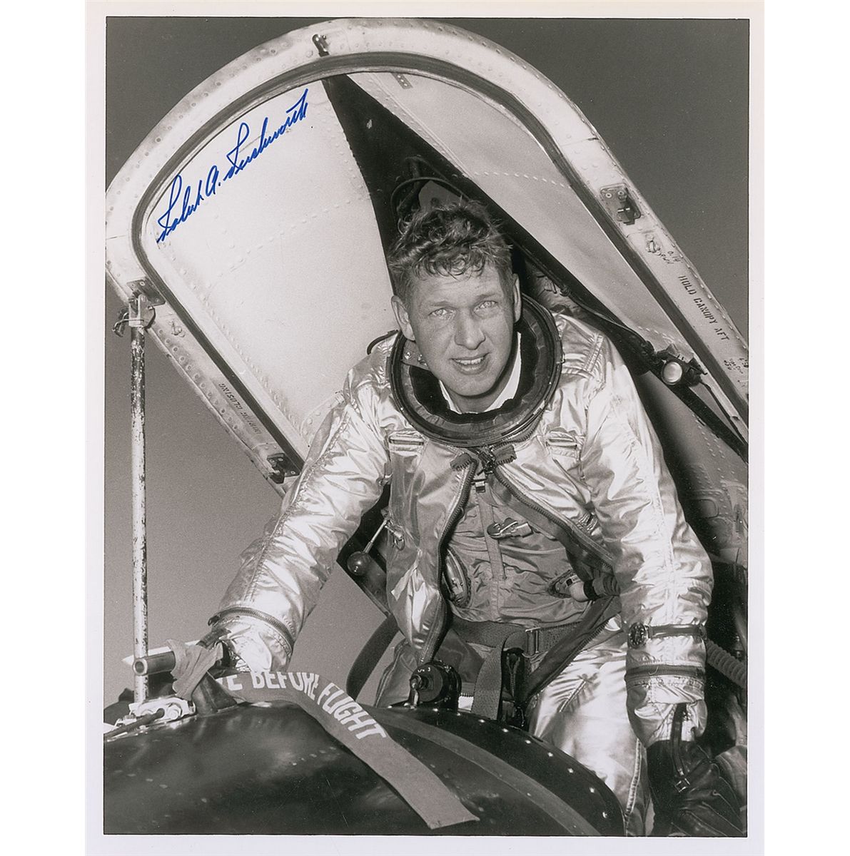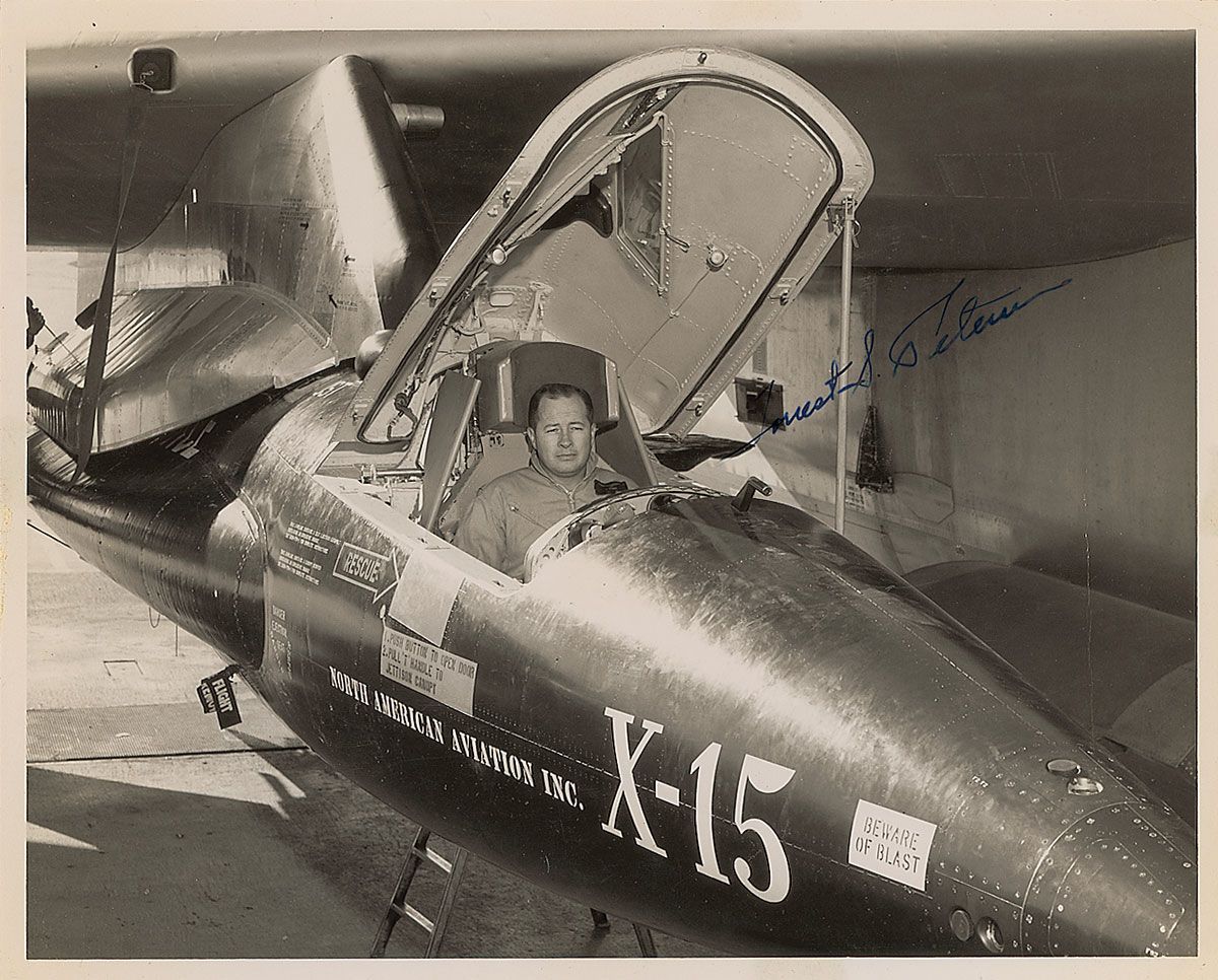 Amazing collection of 12 signed photos of the full roster of X-15 pilots, each measuring approximately 8 x 10 or 10 x 8: vintage glossy photo of Mike Adams in front of a US Air Force jet, signed in blue ballpoint, “Michael J. Adams”; glossy NASA photo of Neil Armstrong with his X-15, signed and inscribed in blue felt tip, “Best wishes to V. J. Nunes, Neil Armstrong”; glossy photo of Joe Walker posing at the cockpit of an X-15, signed in black ink; glossy photo of Scott Crossfield in his flight suit, signed in black felt tip; glossy NASA photo of Milt Thompson with an X-15, signed in black felt tip; glossy NASA photo of Joe Engle with an X-15, signed in black ink, “Joe Engle, Col. USAF”; color satin-finish photo of Bill Dana with an X-15, signed in black felt tip, “With my best wishes, Bill Dana”; glossy NASA photo of Robert White in the cockpit, signed in black felt tip, “Sincere best wishes, Robert M. White, Maj. Gen. USAF”; vintage glossy photo of John B. McKay in front of an X-15, signed in black ink; glossy photo of Forrest S. Petersen seated in the cockpit, signed in blue ink; glossy photo of Robert A. Rushworth, signed in blue felt tip; and a cardstock photo of William J. Knight, signed in black felt tip. In overall fine condition, with scattered surface bends and creases, and a few unobtrusive edge tears. The inclusion of the very rare Adams (1930–1967) makes this an especially remarkable collection—he was the first American space mission fatality, tragically passing in an accident where his X-15 entered a violent Mach 5 spin, causing the aircraft to break apart. Due to the rarity of Adams—especially in signed photo format—the opportunity to acquire a complete set of X-15 pilots rarely, arises.