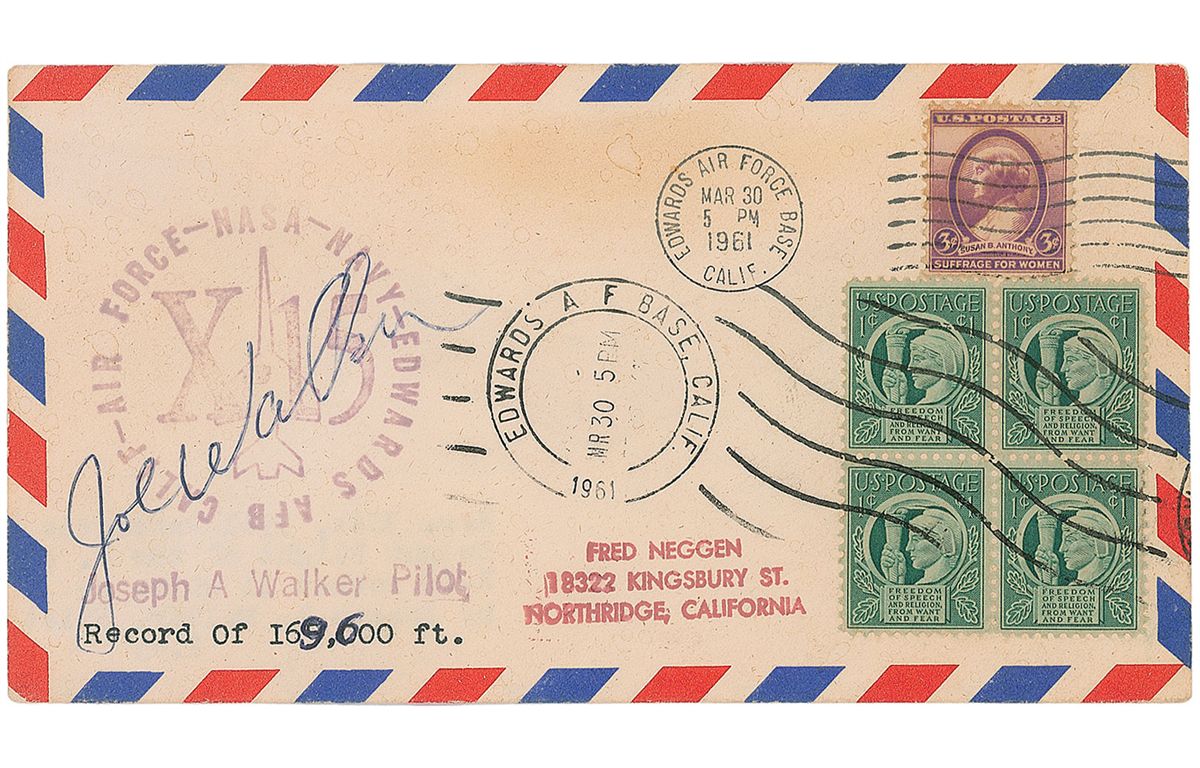 Collection of seven items each signed by a different X-15 pilot. Signers are: Joe Walker (commemorative cover), Forrest Petersen (FDC), Milt Thompson (commemorative cover), Robert White (signature), Joe Engle (signature), Bill Dana (commemorative cover), and Pete Knight (commemorative cover). Three of the items are encapsulated in a plastic PSA/DNA authentication holders. In fine overall condition, with some light toning to Knight’s cover.