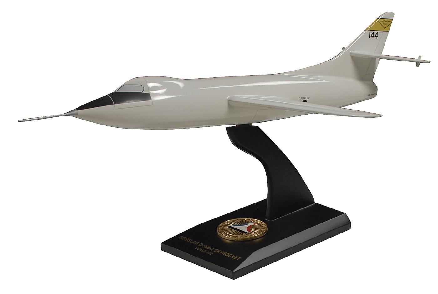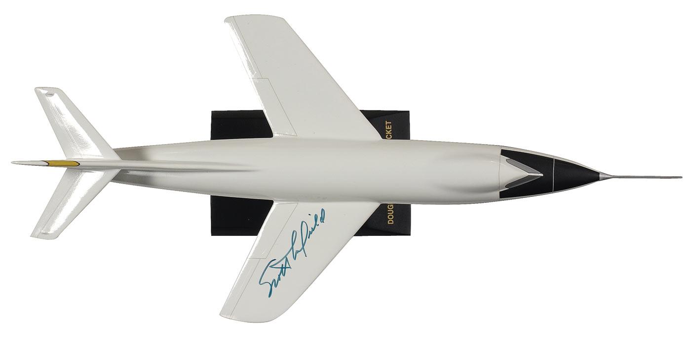A 1/32 scale composite model of a Douglas D-558-2 Skyrocket, signed on the wing in blue felt tip by Crossfield. In fine condition. Crossfield flew this model aircraft at a speed of Mach 2 in November of 1953. Accompanied by a photo taken at time of private signing.