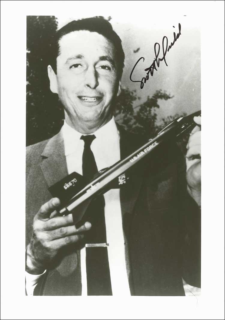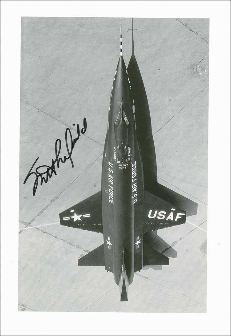 Two signed 8 x 10 photos, one cardstock image of his jet and one glossy of Crossfield holding a model of an X-15, each signed in black felt tip. In fine condition, with a few light creases to cardstock photo. RRAuction COA.