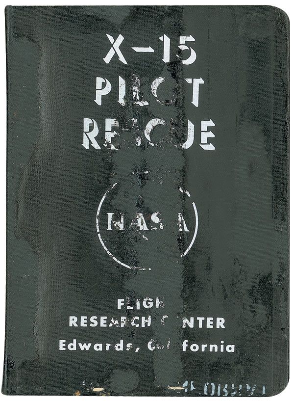 X-15 Pilot Rescue manual, issued by NASA’s Flight Research Center in Edwards, California, hardcover six-ring binder, 6 x 8, 80 pages. This manual outlines the duties and techniques of the pilot rescue personnel who were assigned the task of protecting the lives of the X-15 pilot and B-52 crew and minimizing damage to the aircraft. In very good condition, with some staining, rubbing, and warping to covers.