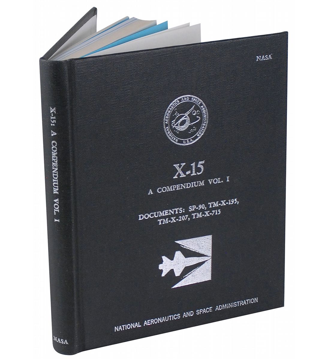 Hardcover book entitled X-15: A Compendium, Vol. I, 7.5 x 9.25, published by NASA, containing reprints of four NASA manuals concerning the X-15, all originally issued in the 1950s and 60s. In fine condition.