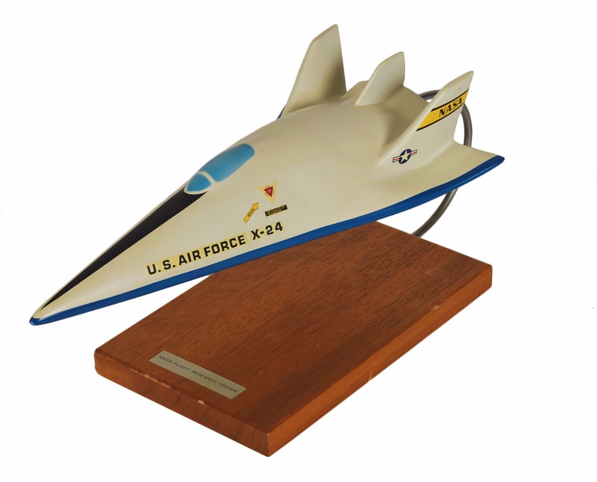 Model of the X-24 Research Vehicle, measuring 24? long and 8? wide, set upon a wooden base with a plaque reading, "NASA Flight Research Center." In very good condition, with a large chip to the corner of one wing and some scattered scuffing. The X-24 was an experimental aircraft developed from a joint USAF-NASA program experimenting with a lifting body design to demonstrate the concept of unpowered reentry and landing.