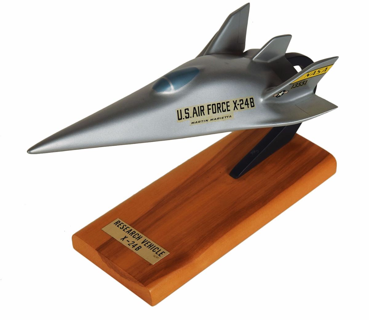 Model of the X-24B Research Vehicle, measuring 10.5? long and 5.5? wide, set upon a wooden base with a plaque reading, "Research Vehicle X-24B." In fine condition. The X-24B was an experimental aircraft developed from a joint USAF-NASA program experimenting with a lifting body design to demonstrate the concept of unpowered reentry and landing.