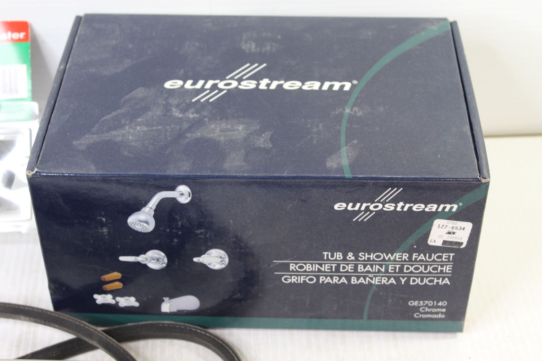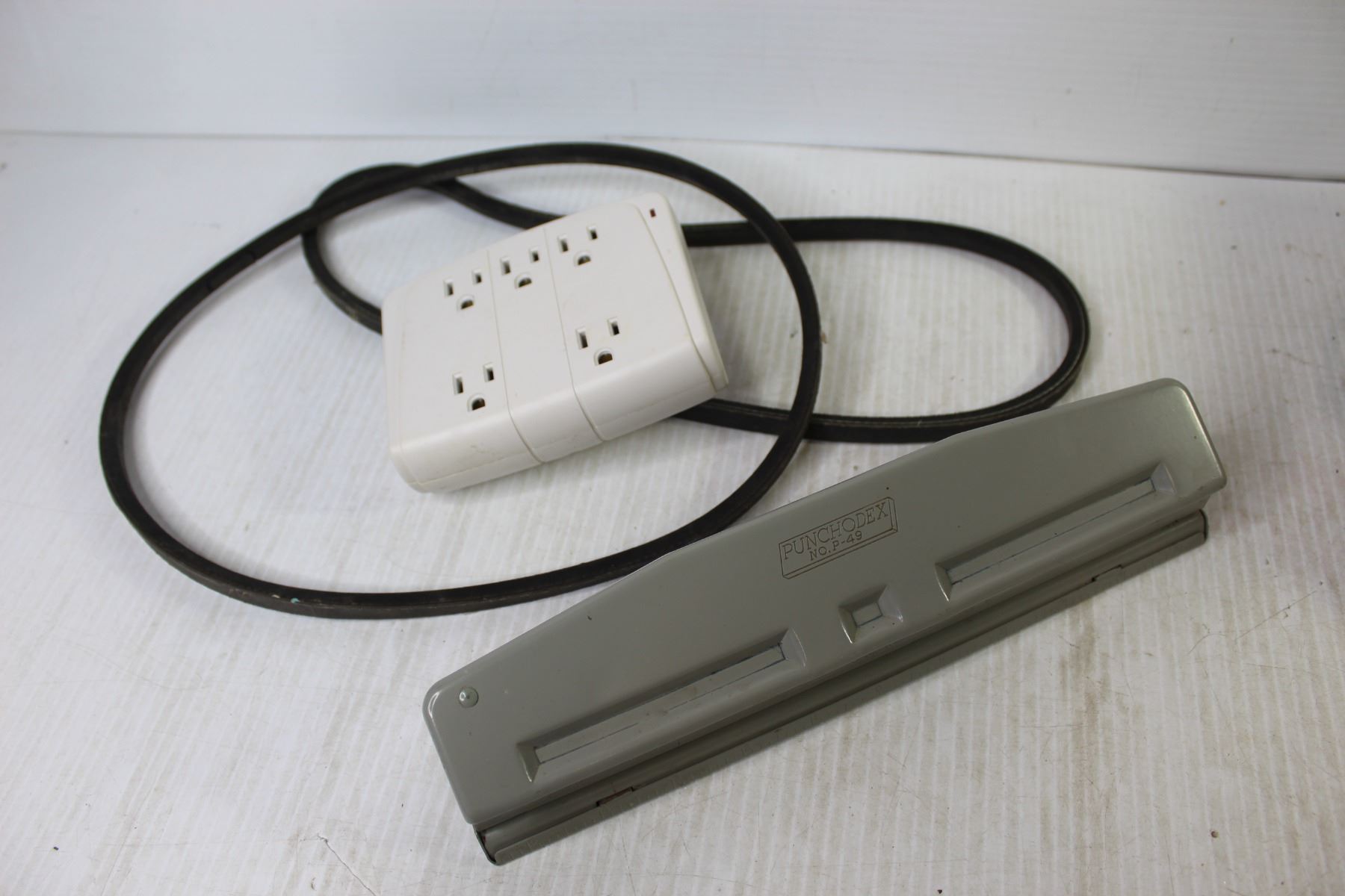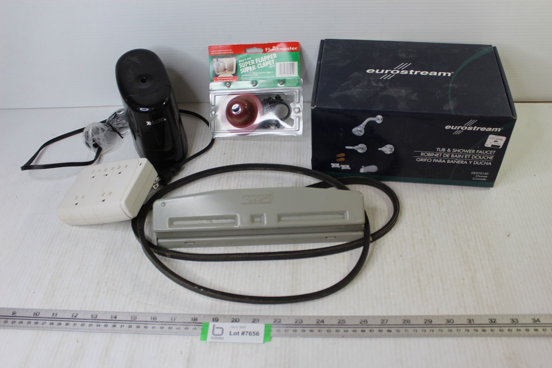 X-Acto Pencil Sharpener (working) - Three Hole Punch - Eurostream Tub & Shower Set (incomplete) - (2) Fan Belts - Toilet Flapper
