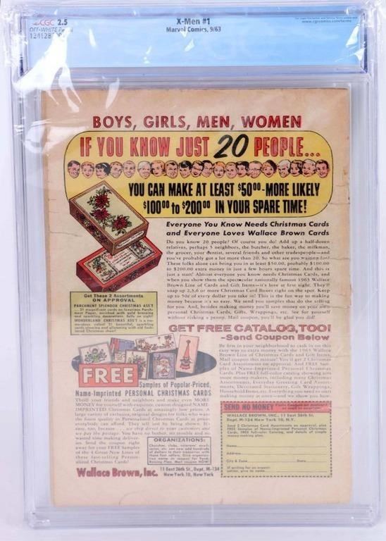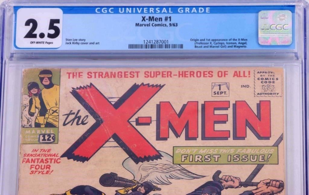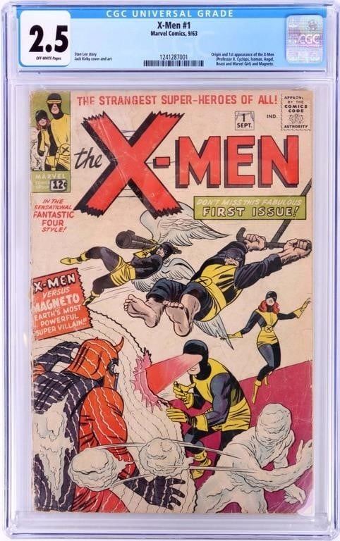 X-Men #1 Origin and 1st appearance of the X-Men (Professor Cyclops, Iceman, Angel, Beast and Marvel Girl) and Magneto. CGC graded 2.5. Stan Lee story with Jack Kirby over art.