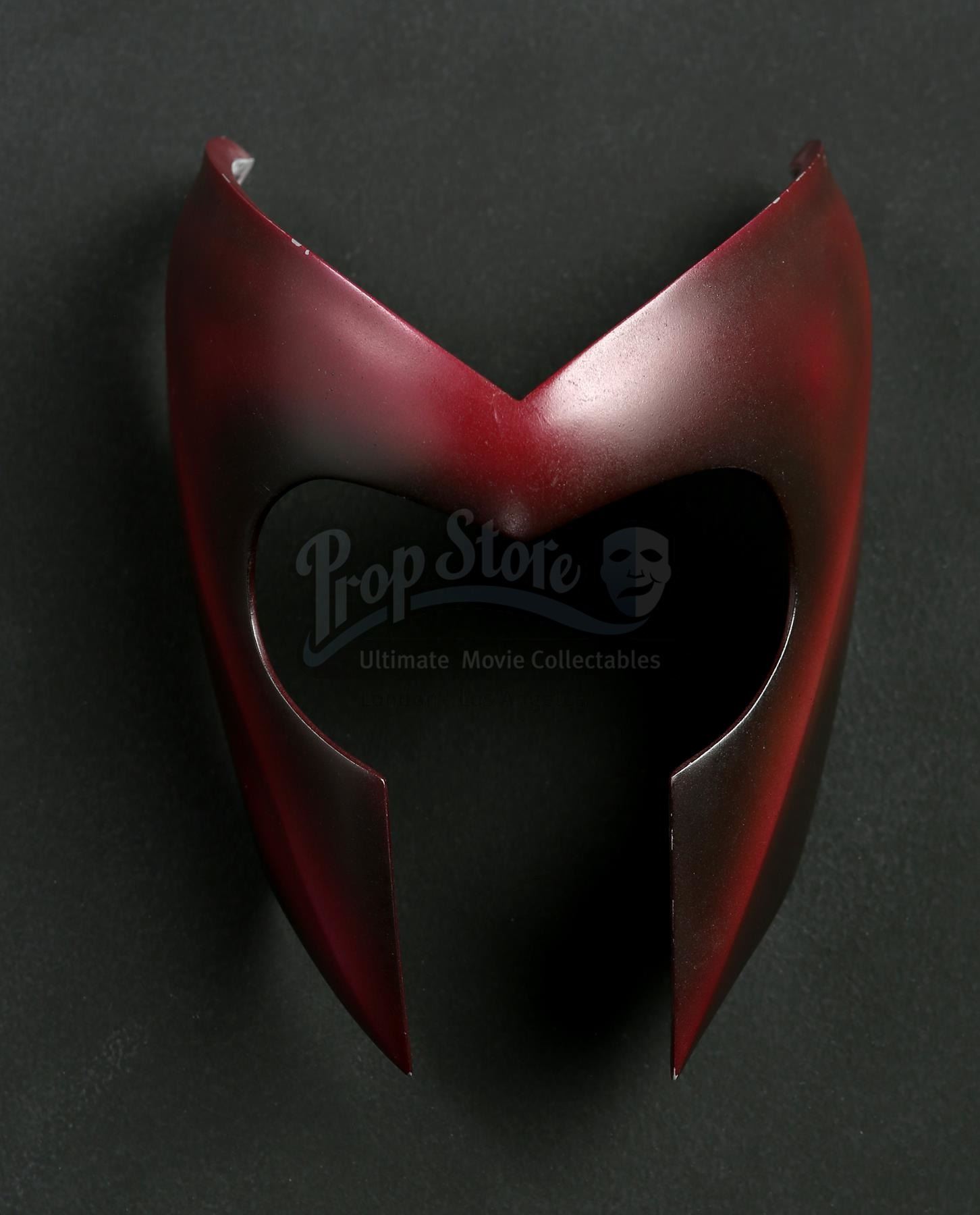 Magneto's two-piece helmet is made of fibreglass and is painted with a multi-toned maroon finish. The helmet's front piece attaches to the back section with two small magnets and Velcro. The inside of the helmet is lined with black leather hide for comfort.