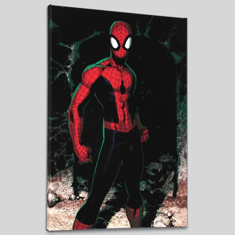 A piece of comic book history, this limited edition, from original art by Chris Bachalo, depicting an eerily backlit Spider-Man. Known for his quirky style, Chris Bachalo has illustrated issues of X-Men Unlimited and Ghost Rider. "X-Men #7" is a limited edition giclee on canvas by Chris Bachalo, presented by Marvel Comics. This piece comes gallery wrapped. Includes Certificate of Authenticity! Measures approx. 18" x 27" (image); 1.5" (depth).