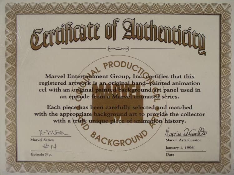 This is an original signed production cel and background from the hit series X-Men. Stan Lee signature is located on the bottom right of cel in black sharpie. * Under a cloud of increasing anti-mutant sentiment, Professor Xavier creates a haven at his Westchester mansion to train young mutants to use their powers for the benefit of humanity, and to prove mutants can be heroes. Xavier recruited Cyclops, Iceman, Angel, Beast and Jean Grey calling them "X-Men" because they possessed the "x-gene", an ability normal humans lacked. Early issues introduced the team's arch enemy, Magneto and his Brotherhood of Evil Mutants, who would later battle the X-Men for years. * HOLY... * * Original Animated Cel Overall Size of the Cel: 10 1/2" x 12 1/2" Overall Size of the background: 10 1/4" x 14 1/4" Excellent Condition This is an original hand-painted cel set-up used in the production of an episode of X-Men titled "Til Death Due Us Part, Part I." Each one-of-a-kind set-up represents a slight change in position of the characters. When individually photographed and projected in rapid succession, the images appear to move. * To create production cels, the original animator's drawing is transferred onto an acetate cel (by hand-inking and/or photo copying). The cel is then hand-painted on the reverse side. The background accompanying this set-up is an original production background. * The cel and original background is ready to be matted and framed. The animators notations are located at the bottom of the cel and background. A certificate of Authenticity from Marvel is on the back of background. The Marvel Seal is located at the top left of the cel. The cel and background are in a protective sleeve An information card about the episode is located at the top right of the protective sleeve. *