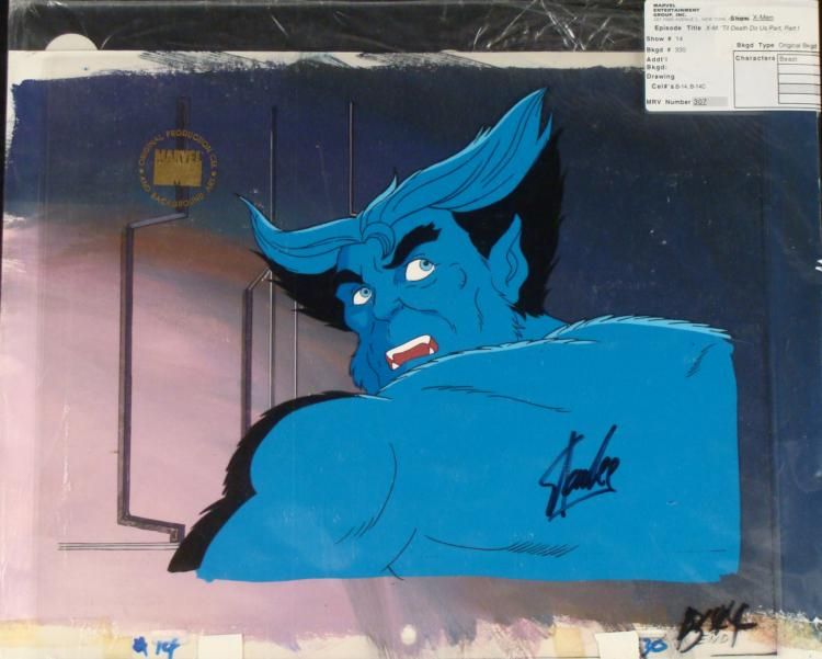 This is an original signed production cel and background from the hit series X-Men. Stan Lee signature is located on the bottom right of cel in black sharpie. * Under a cloud of increasing anti-mutant sentiment, Professor Xavier creates a haven at his Westchester mansion to train young mutants to use their powers for the benefit of humanity, and to prove mutants can be heroes. Xavier recruited Cyclops, Iceman, Angel, Beast and Jean Grey calling them "X-Men" because they possessed the "x-gene", an ability normal humans lacked. Early issues introduced the team's arch enemy, Magneto and his Brotherhood of Evil Mutants, who would later battle the X-Men for years. * HOLY... * * Original Animated Cel Overall Size of the Cel: 10 1/2" x 12 1/2" Overall Size of the background: 10 1/4" x 14 1/4" Excellent Condition This is an original hand-painted cel set-up used in the production of an episode of X-Men titled "Til Death Due Us Part, Part I." Each one-of-a-kind set-up represents a slight change in position of the characters. When individually photographed and projected in rapid succession, the images appear to move. * To create production cels, the original animator's drawing is transferred onto an acetate cel (by hand-inking and/or photo copying). The cel is then hand-painted on the reverse side. The background accompanying this set-up is an original production background. * The cel and original background is ready to be matted and framed. The animators notations are located at the bottom of the cel and background. A certificate of Authenticity from Marvel is on the back of background. The Marvel Seal is located at the top left of the cel. The cel and background are in a protective sleeve An information card about the episode is located at the top right of the protective sleeve. *