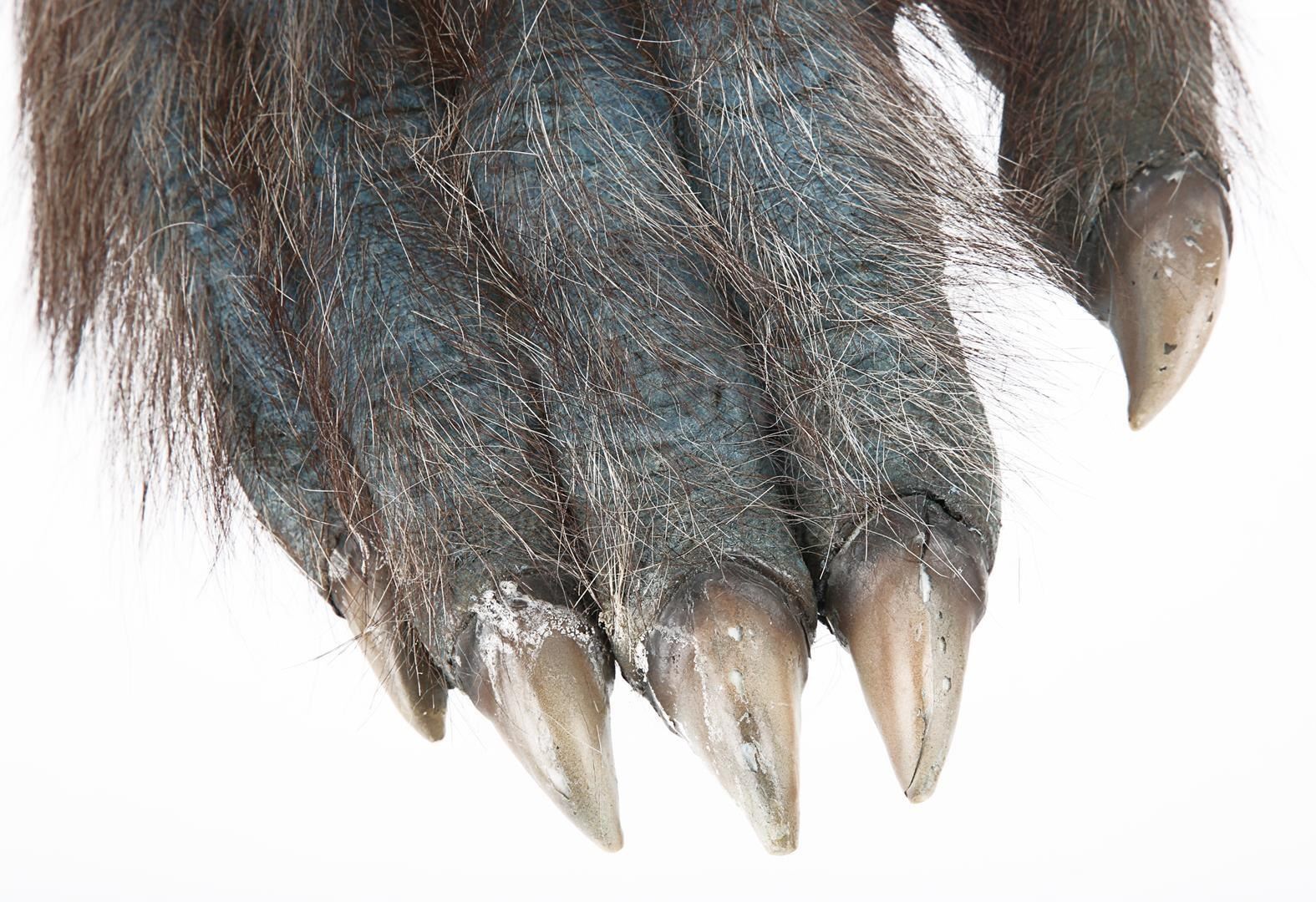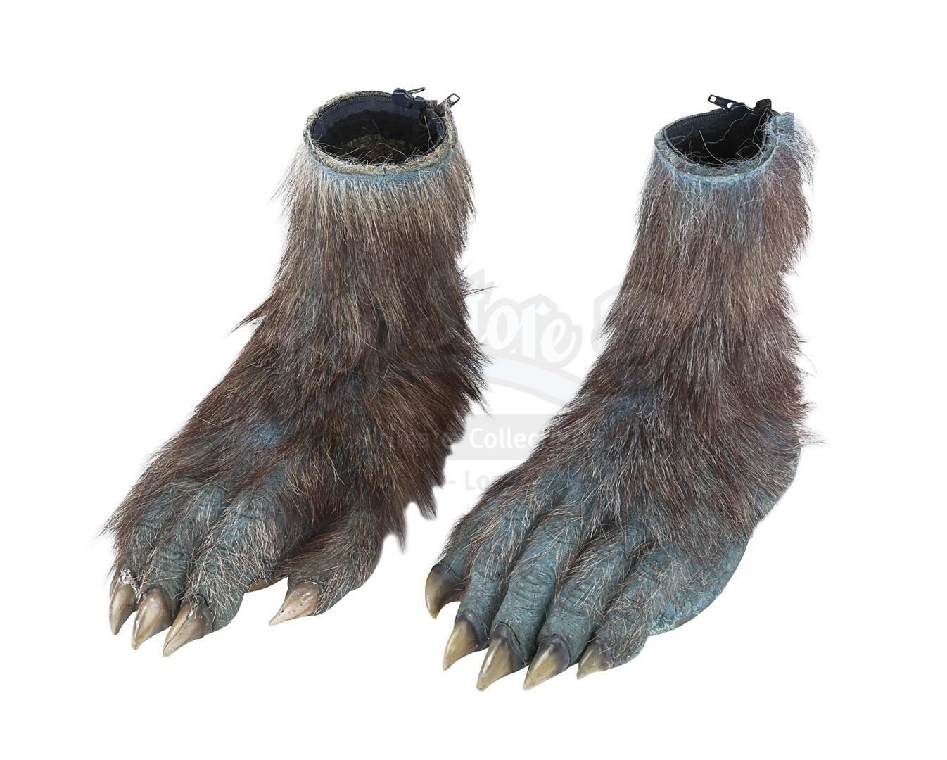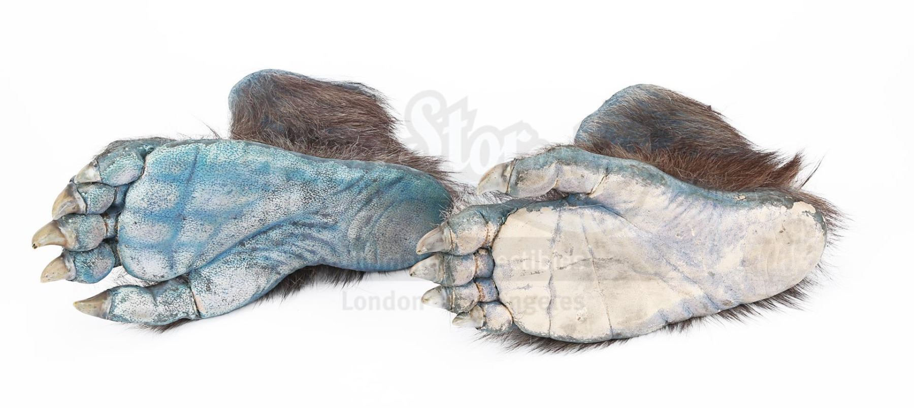 Made of foam latex finished in blue paint, the feet feature five pointed resin claws and wrinkle detailing, and have been covered in brown-and-grey faux fur. Zip fastenings run around the top and down the back of each foot. A label reading "#1 Hero" in black and pink pen is sewn into one foot. The lot exhibits minor paint wear, a crack is present on one of the claws, and one zip on the left foot no longer functions. Dimensions (each foot): 32.5 cm x 15 cm x 25.5 cm (12 3/4" x 6" x 10")