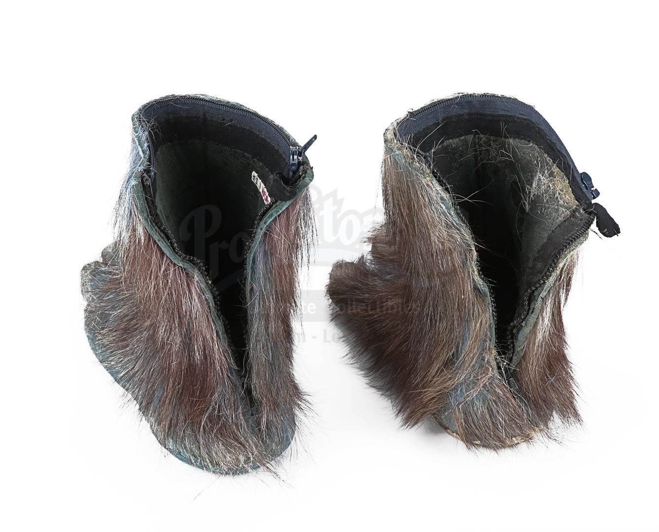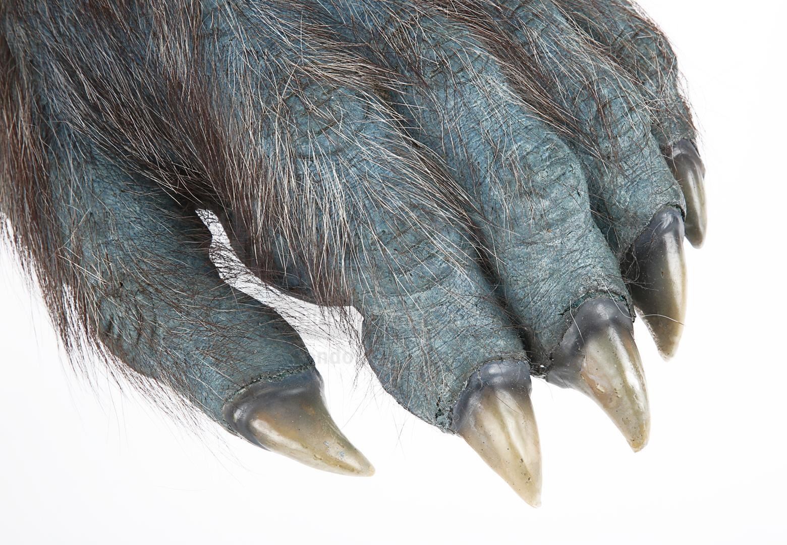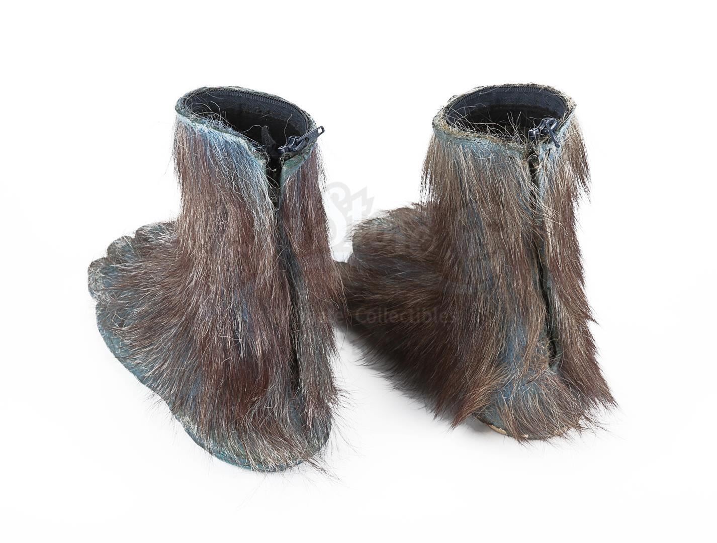 Made of foam latex finished in blue paint, the feet feature five pointed resin claws and wrinkle detailing, and have been covered in brown-and-grey faux fur. Zip fastenings run around the top and down the back of each foot. A label reading "#1 Hero" in black and pink pen is sewn into one foot. The lot exhibits minor paint wear, a crack is present on one of the claws, and one zip on the left foot no longer functions. Dimensions (each foot): 32.5 cm x 15 cm x 25.5 cm (12 3/4" x 6" x 10")